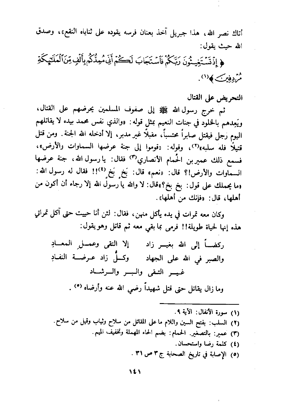 ثم خرج رسول الله صلى الله عليه وسلم إلى صفوف المسلمين يحرضهم على القتال، ويعدهم بالخلود في جنات النعيم بمثل قوله: «والذي نفس محمد بيده لا يقاتلهم اليوم رجل فيقتل صابرا محتسبا، مقبلا غير مدبر، إلا أدخله الله الجنة. ومن قتل قتيلا فله سلبه» «2» ، وقوله: «قوموا إلى جنة عرضها السماوات والأرض» ، فسمع ذلك عمير بن الحمام الأنصاري «3» فقال: يا رسول الله، جنة عرضها السماوات والأرض!؟ قال: «نعم» قال: بخ بخ «4» !! فقال له رسول الله: