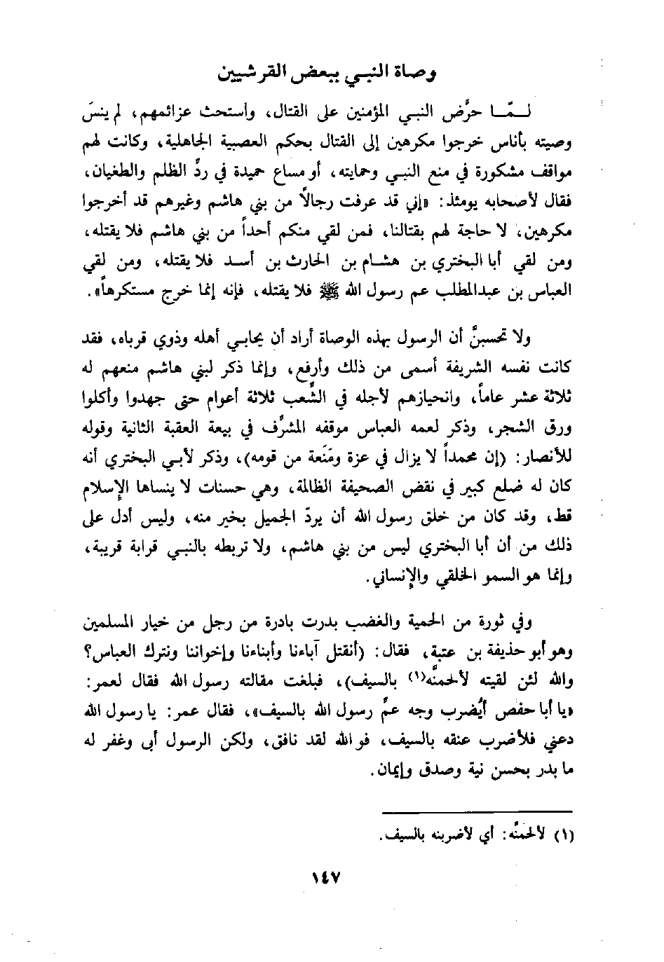 لمّا حرّض النبي المؤمنين على القتال، واستحث عزائمهم، لم ينس وصيته بأناس خرجوا مكرهين إلى القتال بحكم العصبية الجاهلية، وكانت لهم مواقف مشكورة في منع النبي وحمايته، أو مساع حميدة في ردّ الظلم والطغيان، فقال لأصحابه يومئذ: «إني قد عرفت رجالا من بني هاشم وغيرهم قد أخرجوا مكرهين، لا حاجة لهم بقتالنا، فمن لقي منكم أحدا من بني هاشم فلا يقتله، ومن لقي أبا البختري بن هشام بن الحارث بن أسد فلا يقتله، ومن لقي العباس بن عبد المطلب عم رسول الله صلى الله عليه وسلم فلا يقتله، فإنه إنما خرج مستكرها» .