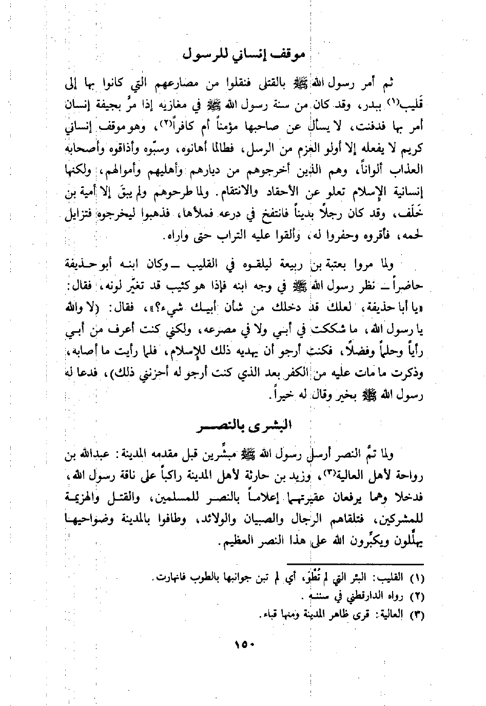 ثم أمر رسول الله صلى الله عليه وسلم بالقتلى فنقلوا من مصارعهم التي كانوا بها إلى قليب «1» ببدر، وقد كان من سنة رسول الله صلى الله عليه وسلم في مغازيه إذا مرّ بجيفة إنسان أمر بها فدفنت، لا يسأل عن صاحبها مؤمنا أم كافرا «2» ، وهو موقف إنساني كريم لا يفعله إلا أولو العزم من الرسل، فطالما أهانوه، وسبّوه وأذاقوه وأصحابه العذاب ألوانا، وهم الذين أخرجوهم من ديارهم وأهليهم وأموالهم، ولكنها إنسانية الإسلام تعلو عن الأحقاد والانتقام. ولما طرحوهم ولم يبق إلا أمية بن خلف، وقد كان رجلا بدينا فانتفخ في درعه فملأها، فذهبوا ليخرجوه فتزايل لحمه، فأقروه وحفروا له، وألقوا عليه التراب حتى واراه.