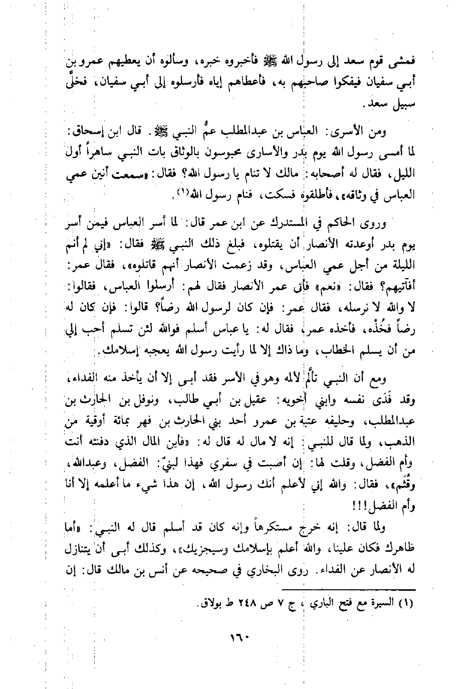 ولما قال: إنه خرج مستكرها وإنه كان قد أسلم قال له النبي: «أما ظاهرك فكان علينا، والله أعلم بإسلامك وسيجزيك» ، وكذلك أبى أن يتنازل له الأنصار عن الفداء. روى البخاري في صحيحه عن أنس بن مالك قال: إن