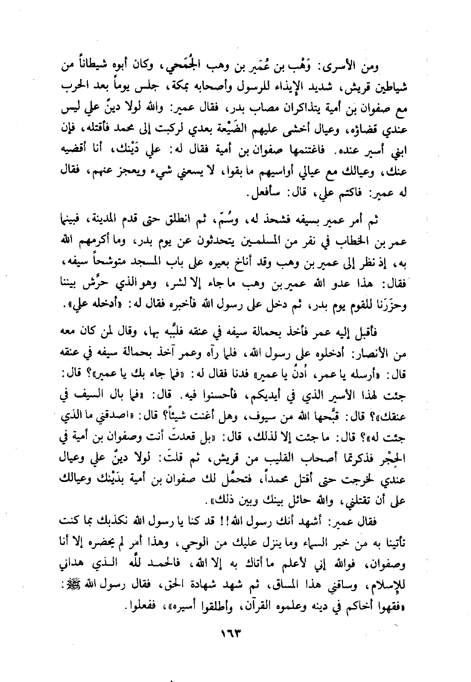 فقال عمير: أشهد أنك رسول الله!! قد كنا يا رسول الله نكذبك بما كنت تأتينا به من خبر السماء وما ينزل عليك من الوحي، وهذا أمر لم يحضره إلا أنا وصفوان، فو الله إني لأعلم ما أتاك به إلا الله، فالحمد لله الذي هداني للإسلام، وساقني هذا المساق، ثم شهد شهادة الحق، فقال رسول الله صلى الله عليه وسلم: