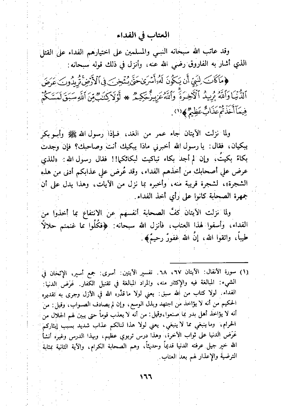 ما كانَ لِنَبِيٍّ أَنْ يَكُونَ لَهُ أَسْرى حَتَّى يُثْخِنَ فِي الْأَرْضِ تُرِيدُونَ عَرَضَ الدُّنْيا وَاللَّهُ يُرِيدُ الْآخِرَةَ وَاللَّهُ عَزِيزٌ حَكِيمٌ. لَوْلا كِتابٌ مِنَ اللَّهِ سَبَقَ لَمَسَّكُمْ فِيما أَخَذْتُمْ عَذابٌ عَظِيمٌ «1» .