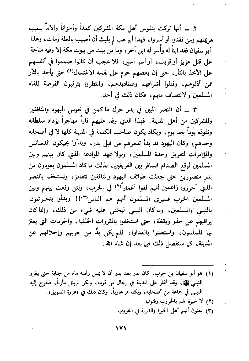 2- أنها تركت بنفوس أهل مكة المشركين كمدا وأحزانا والاما بسبب هزيمتهم ومن فقدوا أو أسروا، فهذا أبو لهب لم يلبث أن أصيب بالعلة ومات، وهذا أبو سفيان فقد ابنا له وأسر له ابن اخر، وما من بيت من بيوت مكة إلا وفيه مناحة على قتل عزيز أو قريب، أو أسر أسير، فلا عجب أن كانوا صمموا في أنفسهم على الأخذ بالثأر، حتى إن بعضهم حرم على نفسه الاغتسال «1» حتى يأخذ بالثأر ممن أذلوهم، وقتلوا أشرافهم وصناديدهم، وانتظروا يترقبون الفرصة للقاء المسلمين والانتصاف منهم، فكان ذلك في أحد.