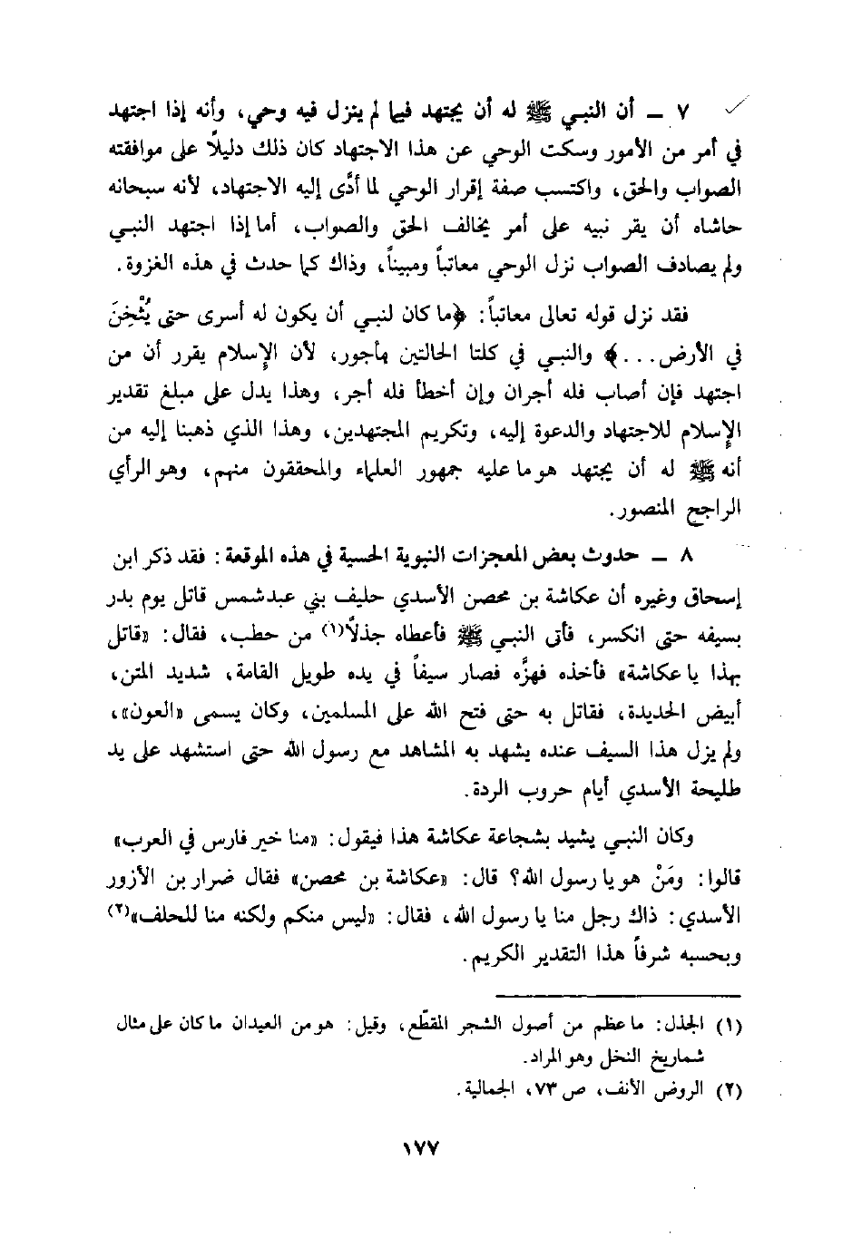 8- حدوث بعض المعجزات النبوية الحسية في هذه الموقعة: فقد ذكر ابن إسحاق وغيره أن عكاشة بن محصن الأسدي حليف بني عبد شمس قاتل يوم بدر بسيفه حتى انكسر، فأتى النبي صلى الله عليه وسلم فأعطاه جذلا «1» من حطب، فقال: «قاتل بهذا يا عكاشة» فأخذه فهزّه فصار سيفا في يده طويل القامة، شديد المتن، أبيض الحديدة، فقاتل به حتى فتح الله على المسلمين، وكان يسمى «العون» ، ولم يزل هذا السيف عنده يشهد به المشاهد مع رسول الله حتى استشهد على يد طليحة الأسدي أيام حروب الردة.