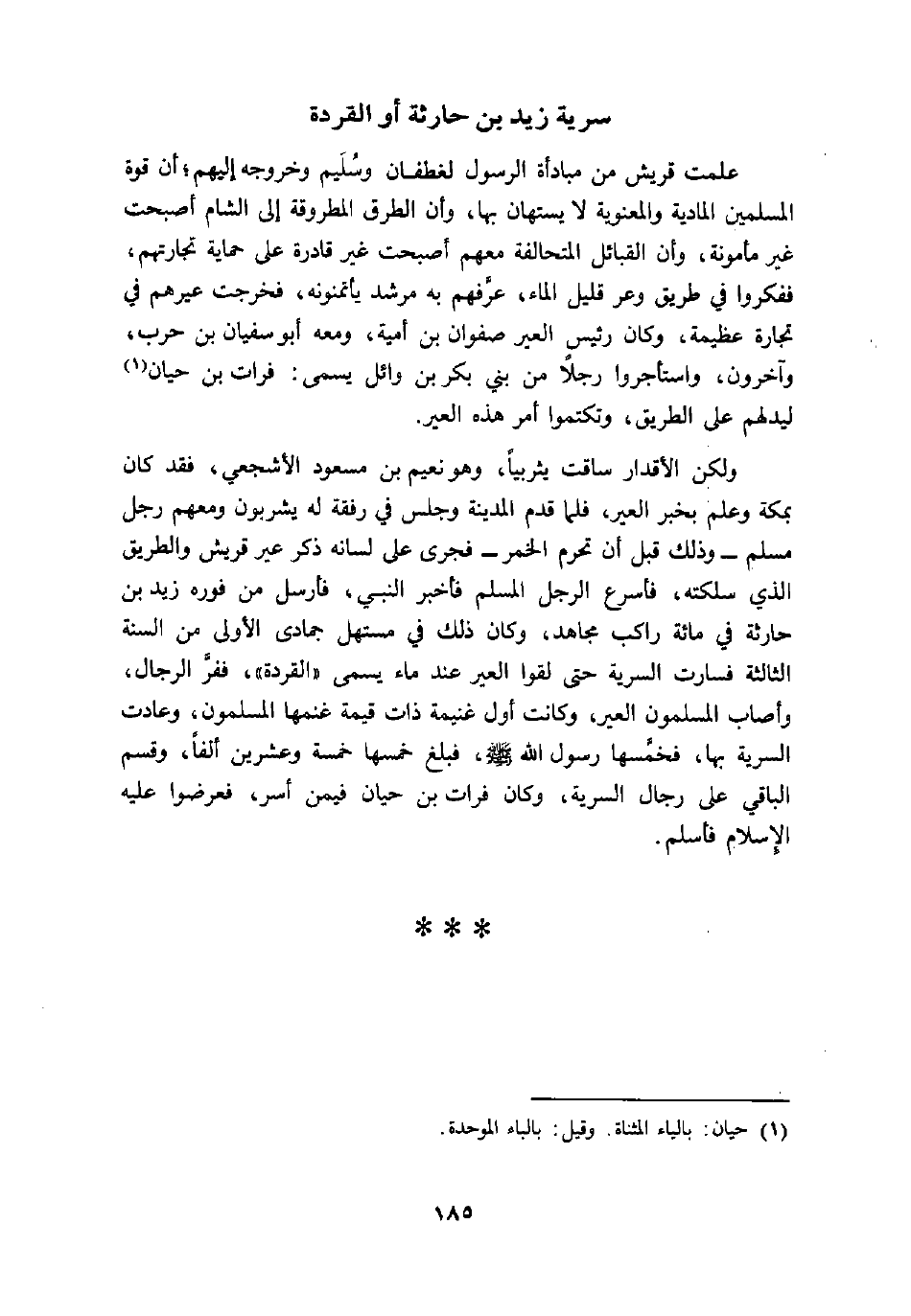 ولكن الأقدار ساقت يثربيا، وهو نعيم بن مسعود الأشجعي، فقد كان بمكة وعلم بخبر العير، فلما قدم المدينة وجلس في رفقة له يشربون ومعهم رجل مسلم- وذلك قبل أن تحرم الخمر- فجرى على لسانه ذكر عير قريش والطريق الذي سلكته، فأسرع الرجل المسلم فأخبر النبي، فأرسل من فوره زيد بن حارثة في مائة راكب مجاهد، وكان ذلك في مستهل جمادى الأولى من السنة الثالثة فسارت السرية حتى لقوا العير عند ماء يسمى «القردة» ، ففرّ الرجال، وأصاب المسلمون العير، وكانت أول غنيمة ذات قيمة غنمها المسلمون، وعادت السرية بها، فخمّسها رسول الله صلى الله عليه وسلم، فبلغ خمسها خمسة وعشرين ألفا، وقسم الباقي على رجال السرية، وكان فرات بن حيان فيمن أسر، فعرضوا عليه الإسلام فأسلم.