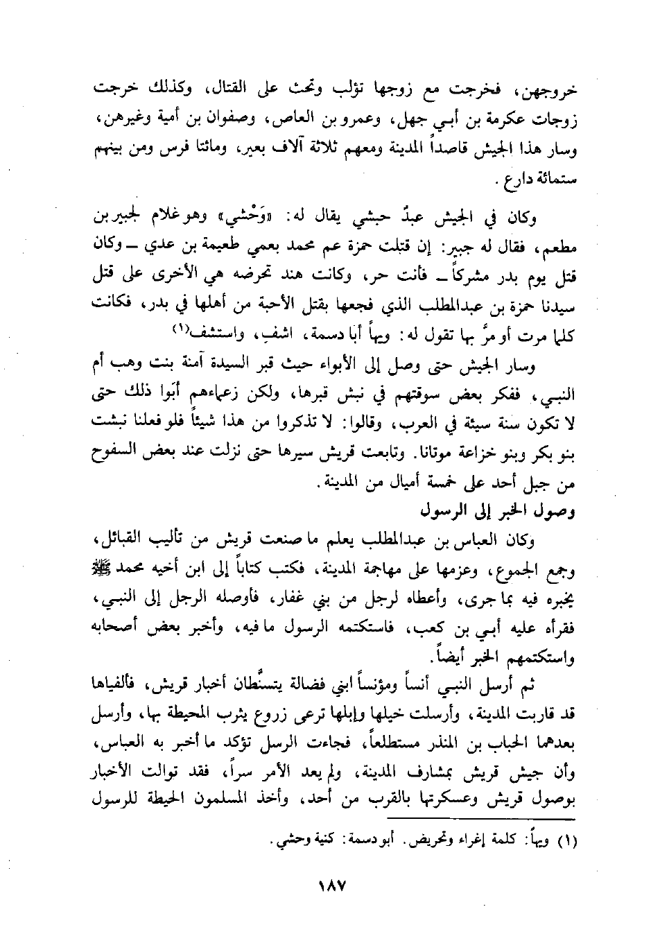 وكان في الجيش عبد حبشي يقال له: «وحشي» وهو غلام لجبير بن مطعم، فقال له جبير: إن قتلت حمزة عم محمد بعمي طعيمة بن عدي- وكان قتل يوم بدر مشركا- فأنت حر، وكانت هند تحرضه هي الاخرى على قتل سيدنا حمزة بن عبد المطلب الذي فجعها بقتل الأحبة من أهلها في بدر، فكانت كلما مرت أو مرّ بها تقول له: ويها أبا دسمة، اشف، واستشف «1»