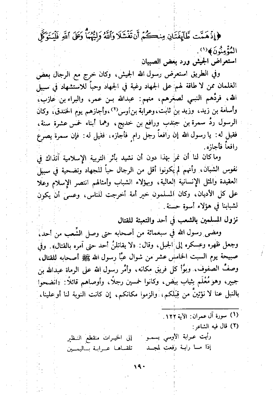 وفي الطريق استعرض رسول الله الجيش، وكان خرج مع الرجال بعض الغلمان ممن لا طاقة لهم على الجهاد رغبة في الجهاد وحبا للاستشهاد في سبيل الله، فردّهم النبي لصغرهم، منهم: عبد الله بن عمر، والبراء بن عازب، وأسامة بن زيد، وزيد بن ثابت، وعرابة بن أوس «2» ، وأجازهم يوم الخندق، وكان الرسول ردّ سمرة بن جندب ورافع بن خديج، وهما أبناء خمس عشرة سنة، فقيل له: يا رسول الله إن رافعا رجل رام فأجازه، فقيل له: فإن سمرة يصرع رافعا فأجازه.