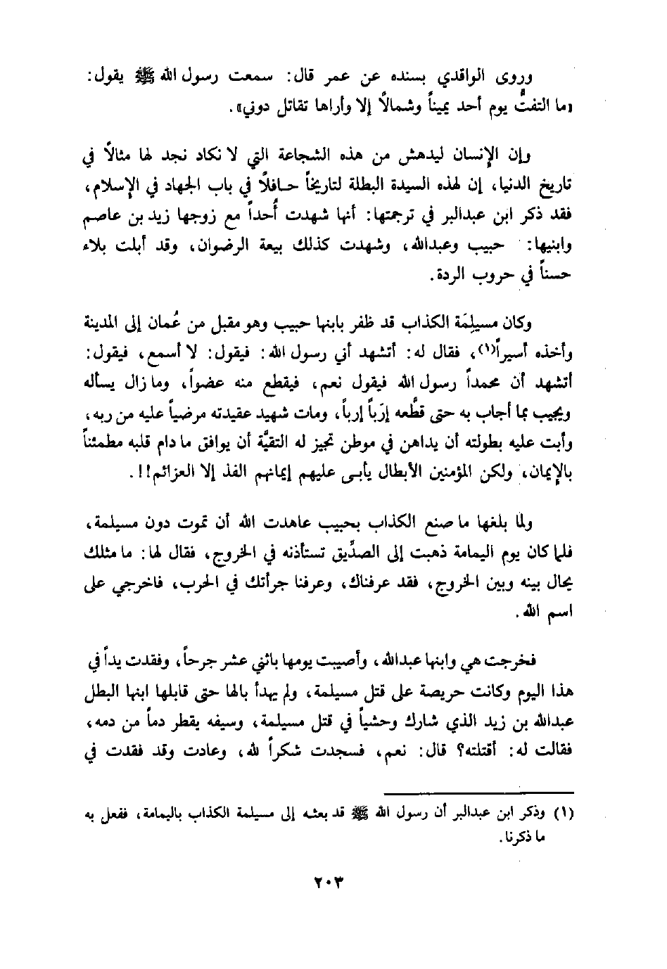 وكان مسيلمة الكذاب قد ظفر بابنها حبيب وهو مقبل من عمان إلى المدينة وأخذه أسيرا «1» ، فقال له: أتشهد أني رسول الله: فيقول: لا أسمع، فيقول: