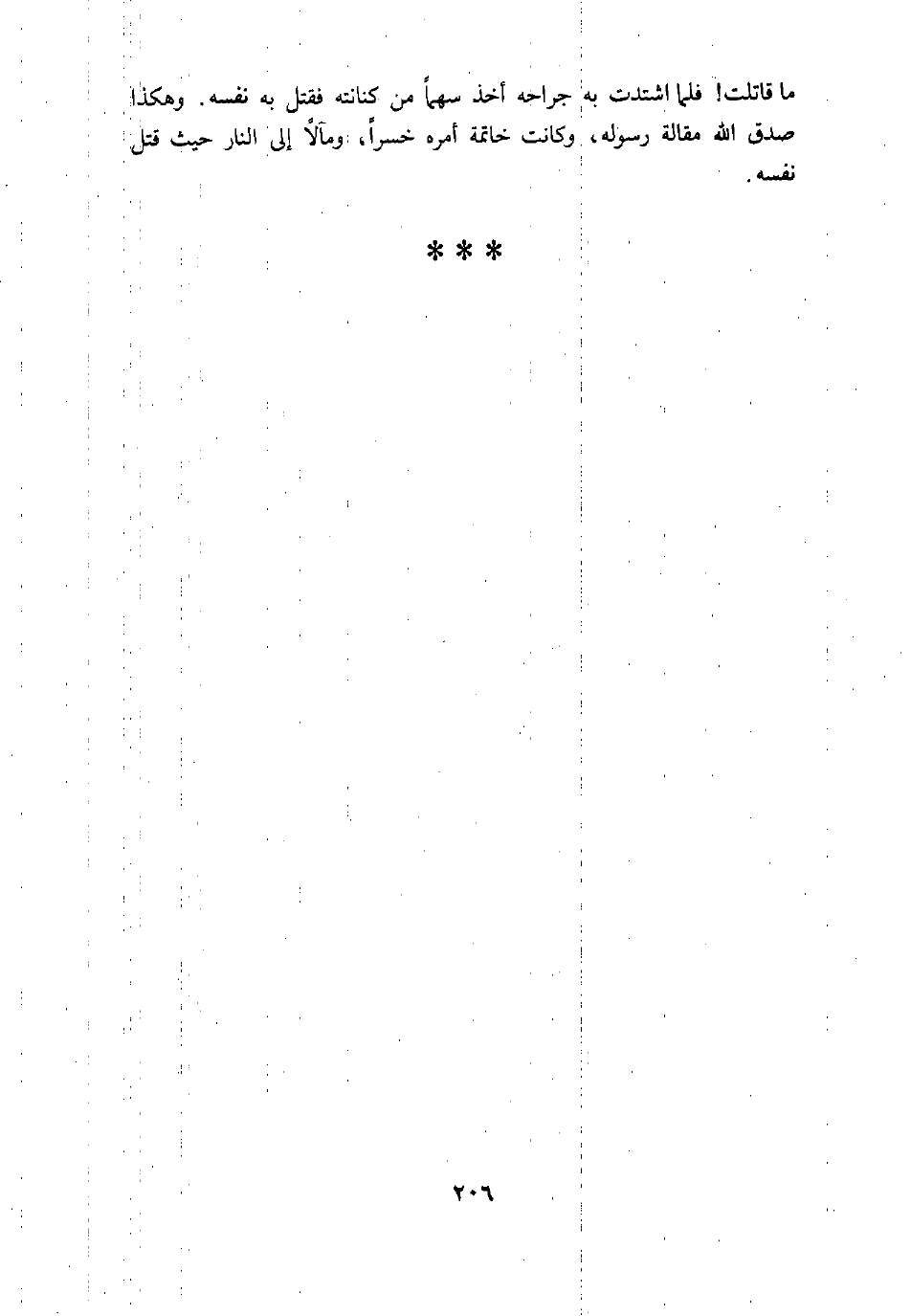 ما قاتلت! فلما اشتدت به جراحه أخذ سهما من كنانته فقتل به نفسه. وهكذا صدق الله مقالة رسوله، وكانت خاتمة أمره خسرا، ومالا إلى النار حيث قتل نفسه.