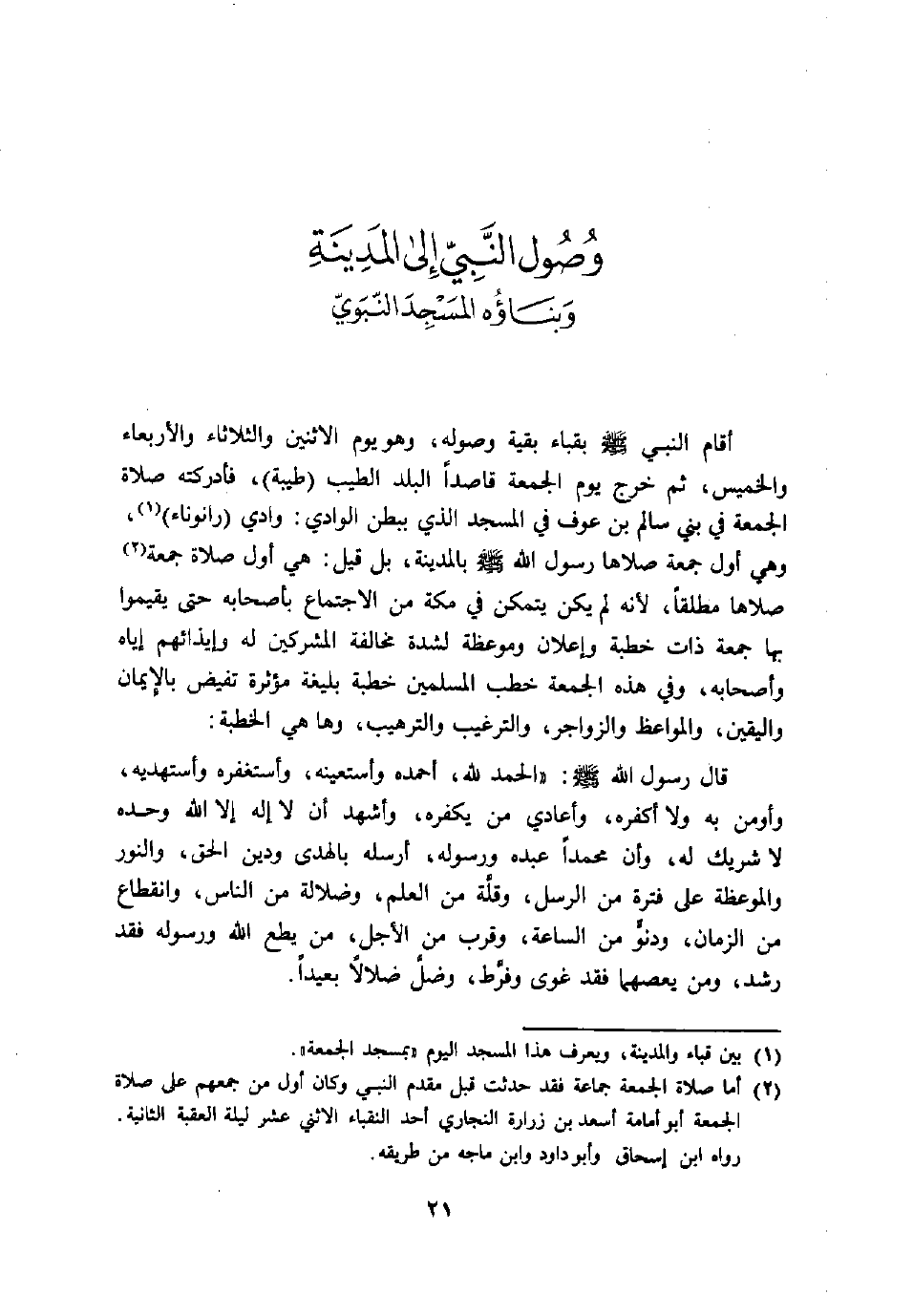 أقام النبي صلى الله عليه وسلم بقباء بقية وصوله، وهو يوم الاثنين والثلاثاء والأربعاء والخميس، ثم خرج يوم الجمعة قاصدا البلد الطيب (طيبة) ، فأدركته صلاة الجمعة في بني سالم بن عوف في المسجد الذي ببطن الوادي: وادي (رانوناء) «1» ، وهي أول جمعة صلاها رسول الله صلى الله عليه وسلم بالمدينة، بل قيل: هي أول صلاة جمعة «2» صلاها مطلقا، لأنه لم يكن يتمكن في مكة من الاجتماع بأصحابه حتى يقيموا بها جمعة ذات خطبة وإعلان وموعظة لشدة مخالفة المشركين له وإيذائهم إياه وأصحابه، وفي هذه الجمعة خطب المسلمين خطبة بليغة مؤثرة تفيض بالإيمان واليقين، والمواعظ والزواجر، والترغيب والترهيب، وها هي الخطبة: