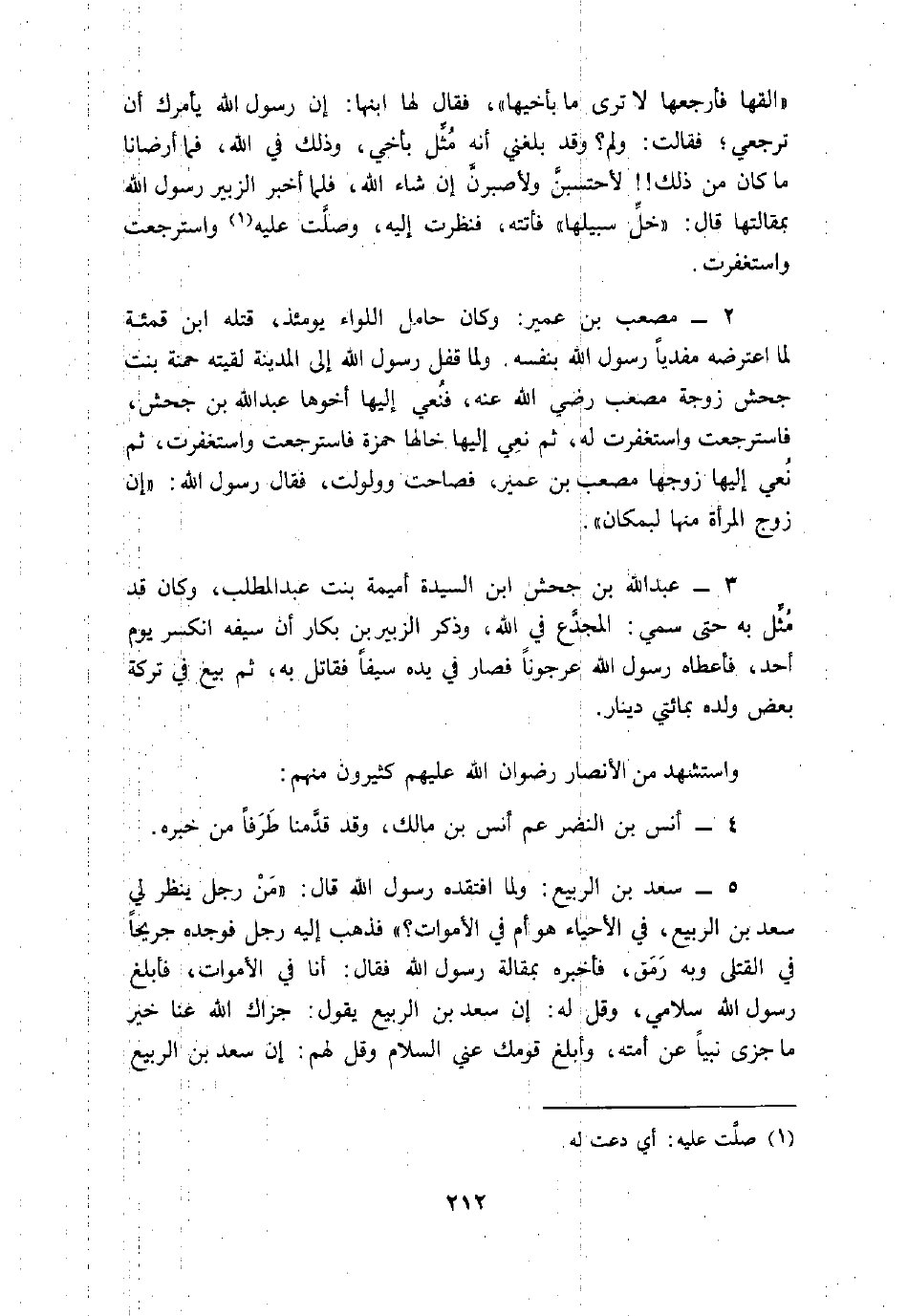 «القها فأرجعها لا ترى ما بأخيها» ، فقال لها ابنها: إن رسول الله يأمرك أن ترجعي؛ فقالت: ولم؟ وقد بلغني أنه مثّل بأخي، وذلك في الله، فما أرضانا ما كان من ذلك!! لأحتسبنّ ولأصبرنّ إن شاء الله، فلما أخبر الزبير رسول الله بمقالتها قال: «خلّ سبيلها» فأتته، فنظرت إليه، وصلّت عليه «1» واسترجعت واستغفرت.