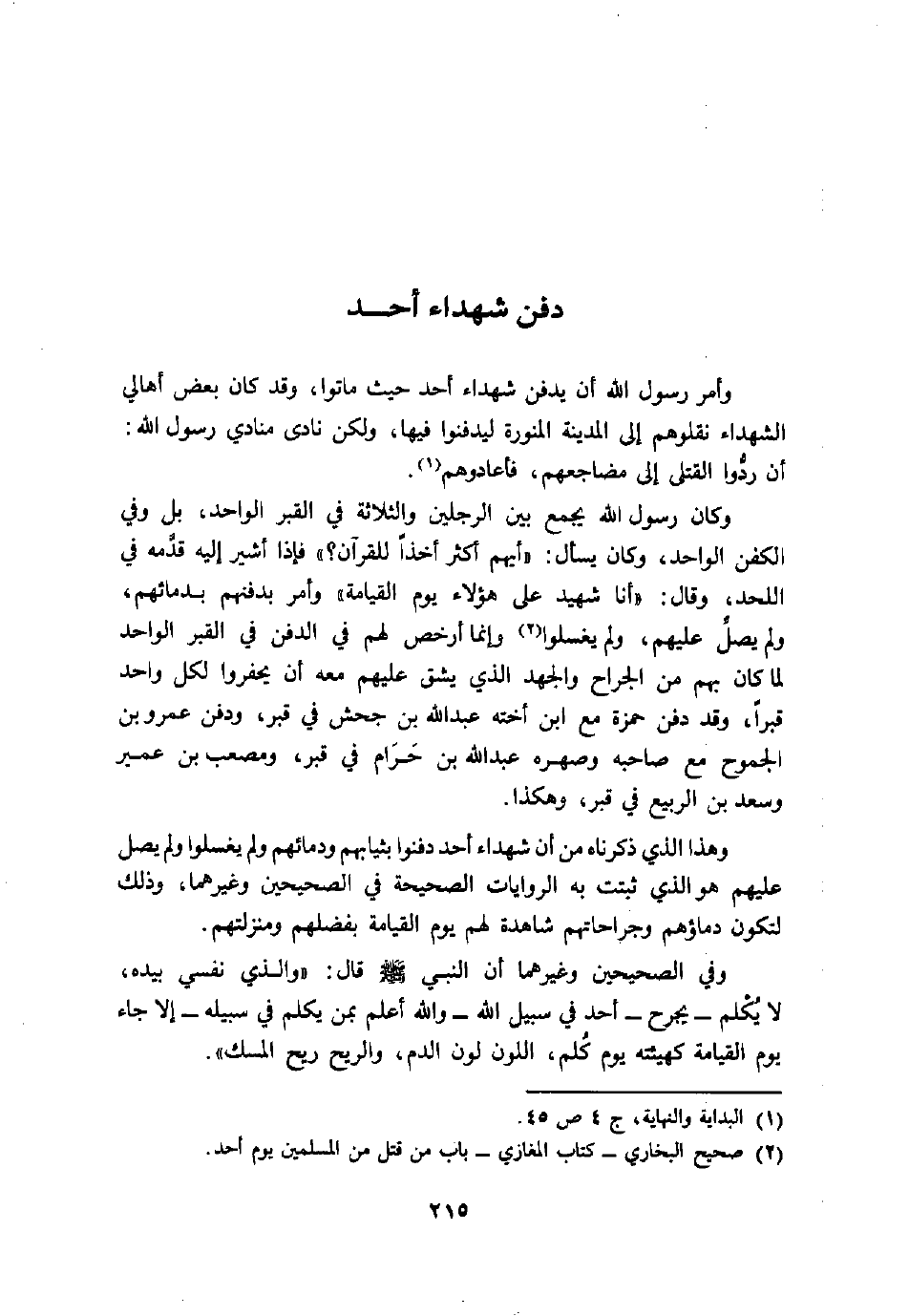 وكان رسول الله يجمع بين الرجلين والثلاثة في القبر الواحد، بل وفي الكفن الواحد، وكان يسأل: «أيهم أكثر أخذا للقران؟» فإذا أشير إليه قدّمه في اللحد، وقال: «أنا شهيد على هؤلاء يوم القيامة» وأمر بدفنهم بدمائهم، ولم يصلّ عليهم، ولم يغسلوا «2» وإنما أرخص لهم في الدفن في القبر الواحد لما كان بهم من الجراح والجهد الذي يشق عليهم معه أن يحفروا لكل واحد قبرا، وقد دفن حمزة مع ابن أخته عبد الله بن جحش في قبر، ودفن عمرو بن الجموح مع صاحبه وصهره عبد الله بن حرام في قبر، ومصعب بن عمير وسعد بن الربيع في قبر، وهكذا.