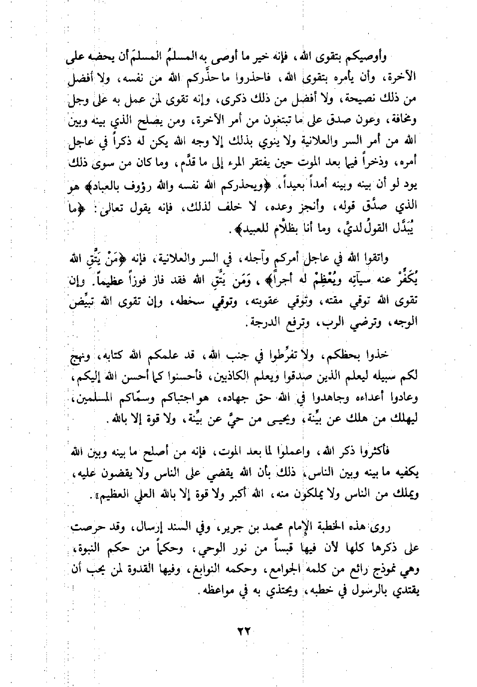 روى هذه الخطبة الإمام محمد بن جرير، وفي السند إرسال، وقد حرصت على ذكرها كلها لأن فيها قبسا من نور الوحي، وحكما من حكم النبوة، وهي نموذج رائع من كلمه الجوامع، وحكمه النوابغ، وفيها القدوة لمن يحب أن يقتدي بالرسول في خطبه، ويحتذي به في مواعظه.