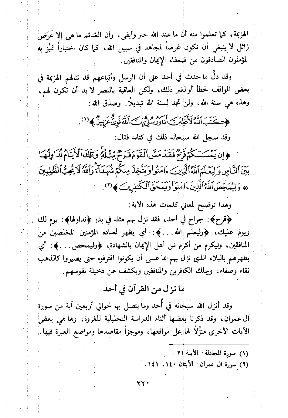 وقد أنزل الله سبحانه في أحد وما يتصل بها حوالي أربعين اية من سورة ال عمران، وقد ذكرنا بعضها أثناء الدراسة التحليلية للغزوة، وها هي بعض الايات الاخرى منزّلا لها على مواقعها، وموجزا مقاصدها ومواضع العبرة فيها.