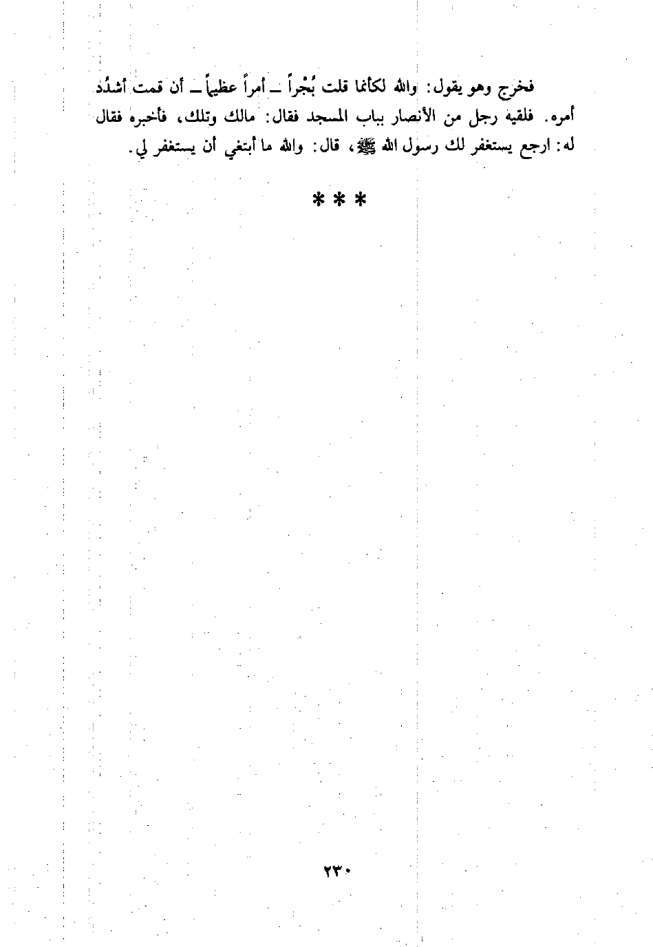 فخرج وهو يقول: والله لكأنما قلت بجرا- أمرا عظيما- أن قمت أشدد أمره. فلقيه رجل من الأنصار بباب المسجد فقال: مالك وتلك، فأخبره فقال له: ارجع يستغفر لك رسول الله صلى الله عليه وسلم، قال: والله ما أبتغي أن يستغفر لي.