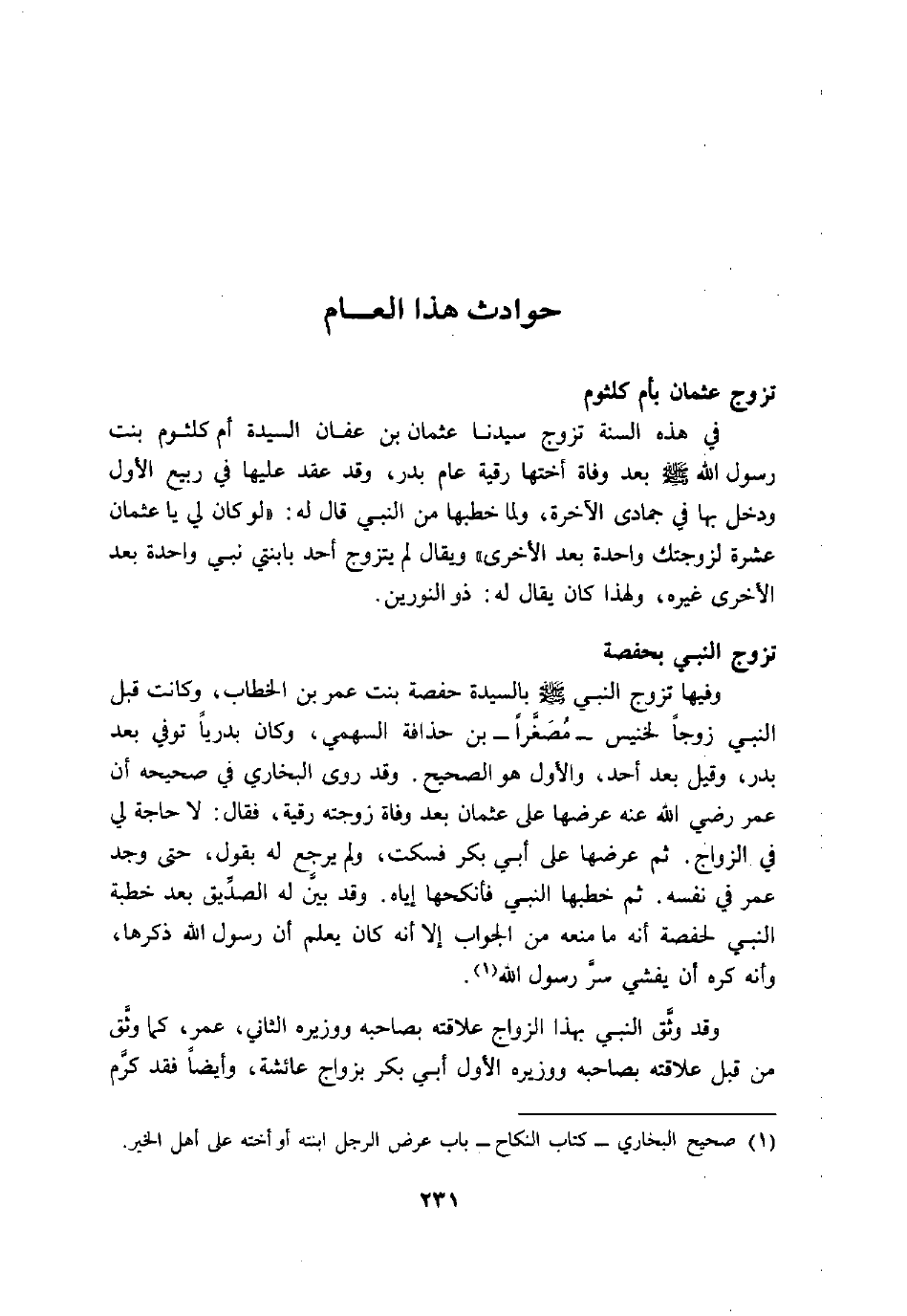 وفيها تزوج النبي صلى الله عليه وسلم بالسيدة حفصة بنت عمر بن الخطاب، وكانت قبل النبي زوجا لخنيس- مصغّرا- بن حذافة السهمي، وكان بدريا توفي بعد بدر، وقيل بعد أحد، والأول هو الصحيح. وقد روى البخاري في صحيحه أن عمر رضي الله عنه عرضها على عثمان بعد وفاة زوجته رقية، فقال: لا حاجة لي في الزواج. ثم عرضها على أبي بكر فسكت، ولم يرجع له بقول، حتى وجد عمر في نفسه. ثم خطبها النبي فأنكحها إياه. وقد بيّن له الصدّيق بعد خطبة النبي لحفصة أنه ما منعه من الجواب إلا أنه كان يعلم أن رسول الله ذكرها، وأنه كره أن يفشي سرّ رسول الله «1» .