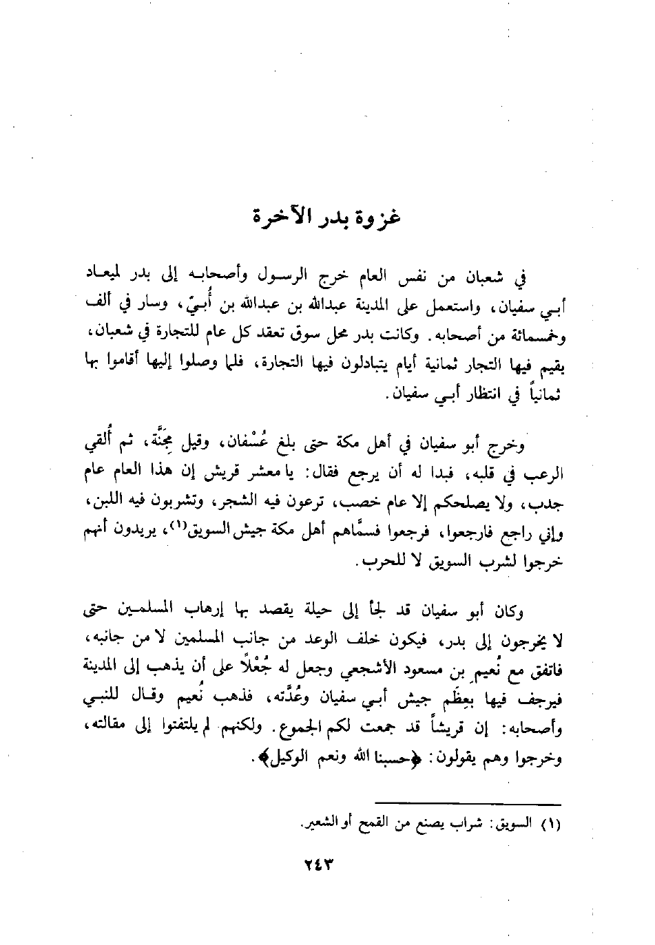 وخرج أبو سفيان في أهل مكة حتى بلغ عسفان، وقيل مجنّة، ثم ألقي الرعب في قلبه، فبدا له أن يرجع فقال: يا معشر قريش إن هذا العام عام جدب، ولا يصلحكم إلا عام خصب، ترعون فيه الشجر، وتشربون فيه اللبن، وإني راجع فارجعوا، فرجعوا فسمّاهم أهل مكة جيش السويق «1» ، يريدون أنهم خرجوا لشرب السويق لا للحرب.