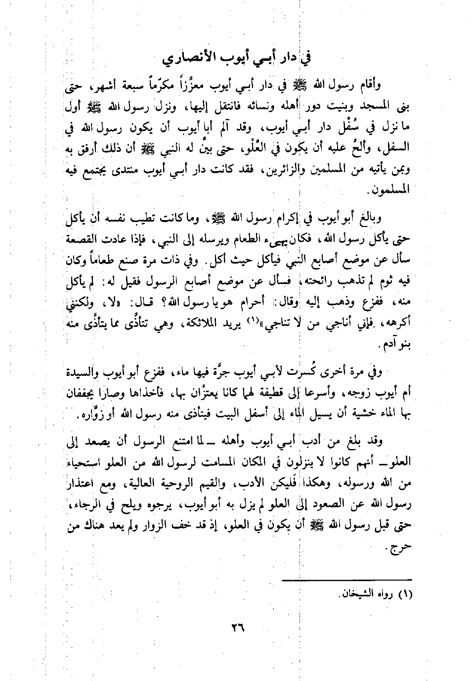 وقد بلغ من أدب أبي أيوب وأهله- لما امتنع الرسول أن يصعد إلى العلو- أنهم كانوا لا ينزلون في المكان المسامت لرسول الله من العلو استحياء من الله ورسوله، وهكذا فليكن الأدب، والقيم الروحية العالية، ومع اعتذار رسول الله عن الصعود إلى العلو لم يزل به أبو أيوب، يرجوه ويلح في الرجاء، حتى قبل رسول الله صلى الله عليه وسلم أن يكون في العلو، إذ قد خف الزوار ولم يعد هناك من حرج.