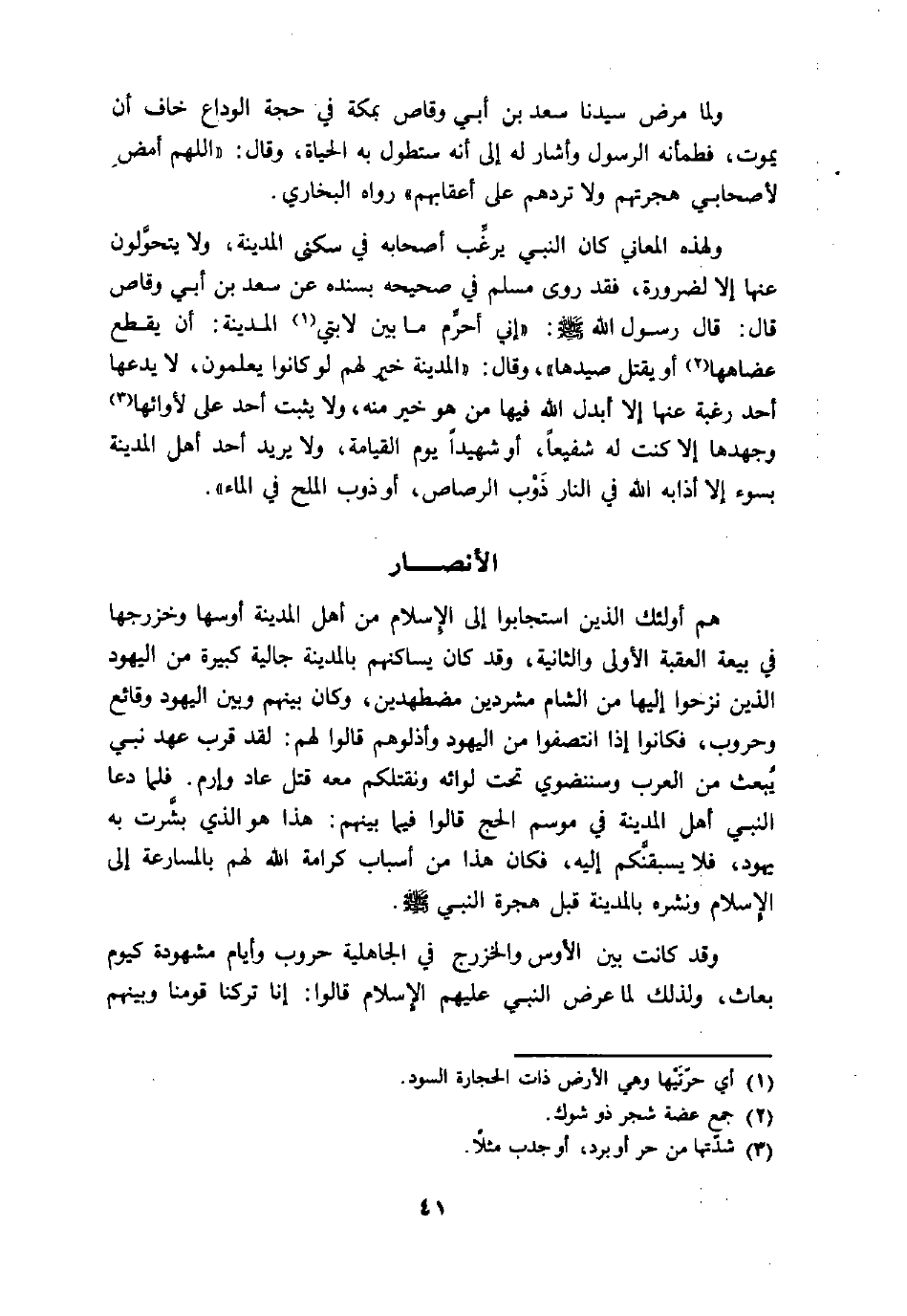 ولهذه المعاني كان النبي يرغّب أصحابه في سكنى المدينة، ولا يتحوّلون عنها إلا لضرورة، فقد روى مسلم في صحيحه بسنده عن سعد بن أبي وقاص قال: قال رسول الله صلى الله عليه وسلم: «إني أحرّم ما بين لابتي «1» المدينة: أن يقطع عضاهها «2» أو يقتل صيدها» ، وقال: «المدينة خير لهم لو كانوا يعلمون، لا يدعها أحد رغبة عنها إلا أبدل الله فيها من هو خير منه، ولا يثبت أحد على لأوائها «3» وجهدها إلا كنت له شفيعا، أو شهيدا يوم القيامة، ولا يريد أحد أهل المدينة بسوء إلا أذابه الله في النار ذوب الرصاص، أو ذوب الملح في الماء» .
