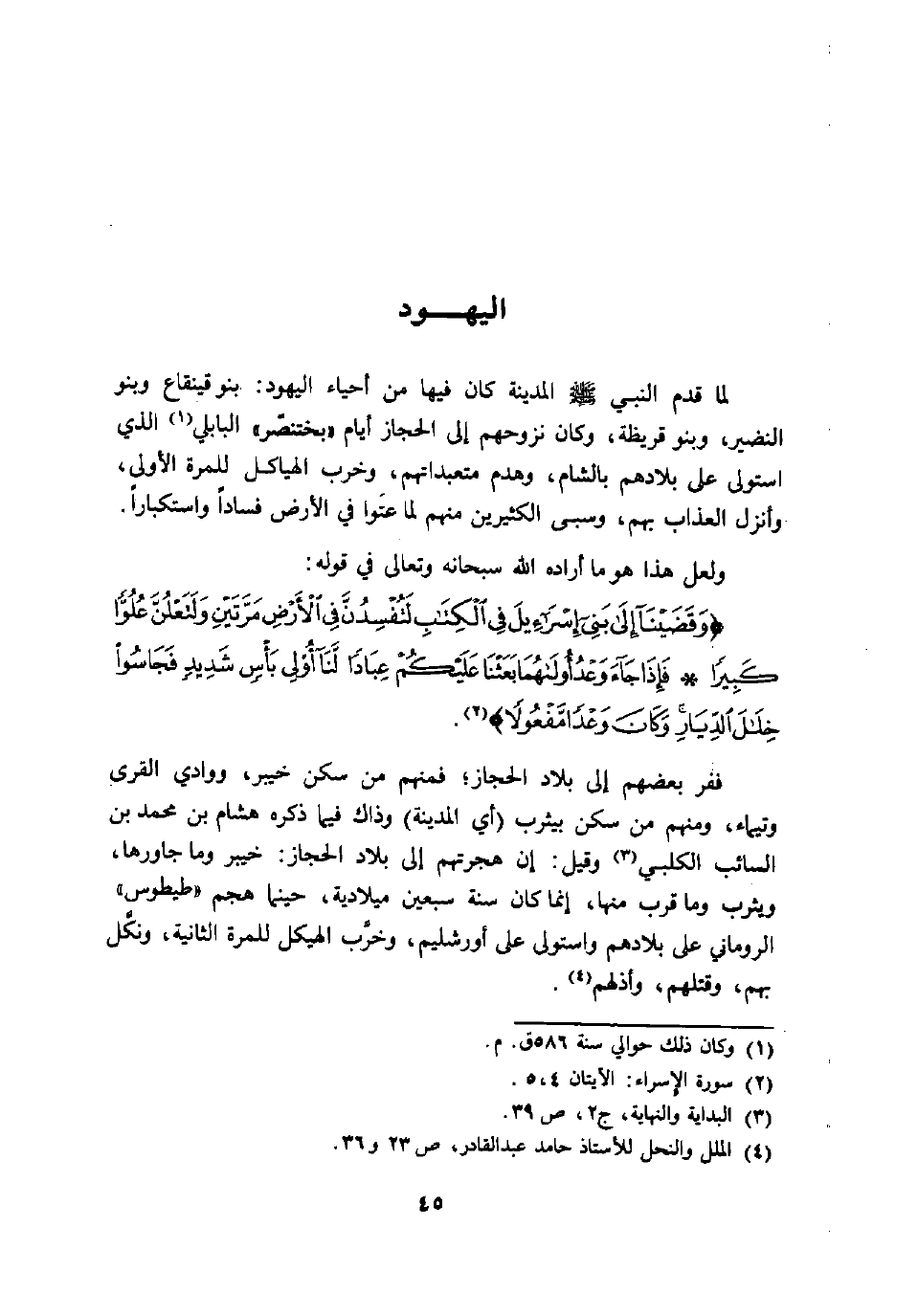 لما قدم النبي صلى الله عليه وسلم المدينة كان فيها من أحياء اليهود: بنو قينقاع وبنو النضير، وبنو قريظة، وكان نزوحهم إلى الحجاز أيام «بختنصّر» البابلي «1» الذي استولى على بلادهم بالشام، وهدم متعبداتهم، وخرب الهياكل للمرة الأولى، وأنزل العذاب بهم، وسبى الكثيرين منهم لما عتوا في الأرض فسادا واستكبارا.