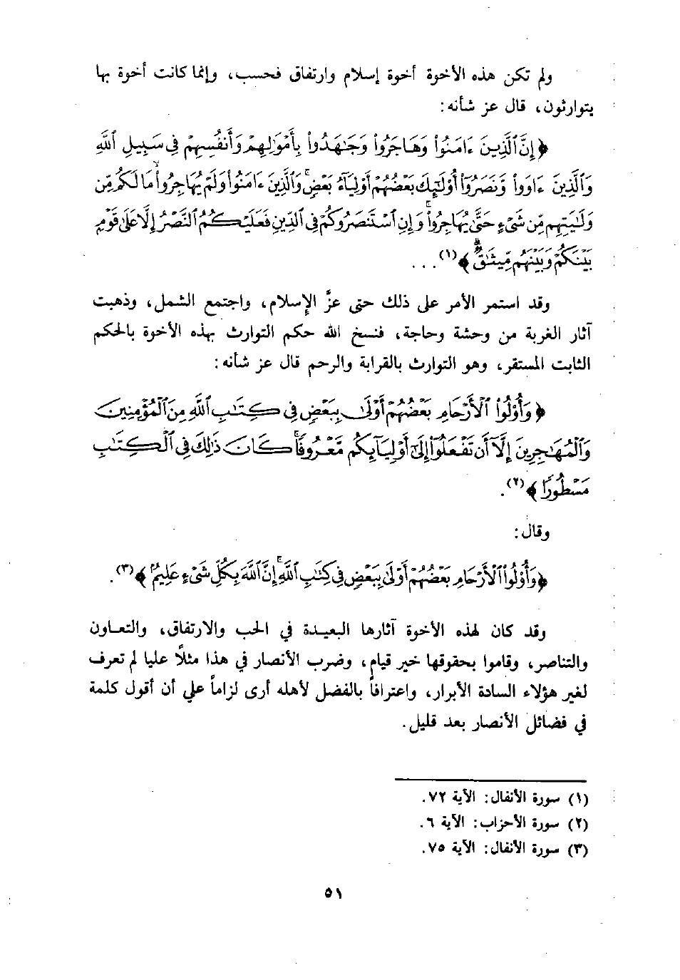 إِنَّ الَّذِينَ آمَنُوا وَهاجَرُوا وَجاهَدُوا بِأَمْوالِهِمْ وَأَنْفُسِهِمْ فِي سَبِيلِ اللَّهِ وَالَّذِينَ آوَوْا وَنَصَرُوا أُولئِكَ بَعْضُهُمْ أَوْلِياءُ بَعْضٍ وَالَّذِينَ آمَنُوا وَلَمْ يُهاجِرُوا ما لَكُمْ مِنْ وَلايَتِهِمْ مِنْ شَيْءٍ حَتَّى يُهاجِرُوا وَإِنِ اسْتَنْصَرُوكُمْ فِي الدِّينِ فَعَلَيْكُمُ النَّصْرُ إِلَّا عَلى قَوْمٍ بَيْنَكُمْ وَبَيْنَهُمْ مِيثاقٌ «1» ...