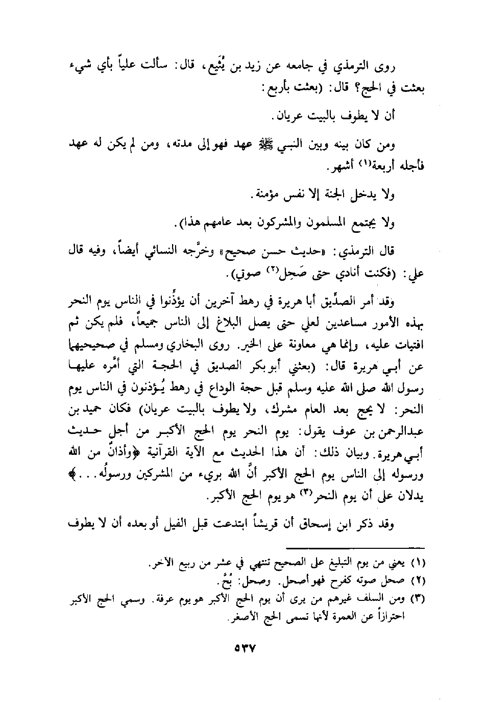 (3) ومن السلف غيرهم من يرى أن يوم الحج الأكبر هو يوم عرفة. وسمي الحج الأكبر احترازا عن العمرة لأنها تسمى الحج الأصغر.