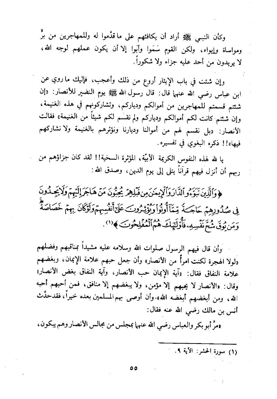 وَالَّذِينَ تَبَوَّؤُا الدَّارَ وَالْإِيمانَ مِنْ قَبْلِهِمْ يُحِبُّونَ مَنْ هاجَرَ إِلَيْهِمْ وَلا يَجِدُونَ فِي صُدُورِهِمْ حاجَةً مِمَّا أُوتُوا وَيُؤْثِرُونَ عَلى أَنْفُسِهِمْ وَلَوْ كانَ بِهِمْ خَصاصَةٌ وَمَنْ يُوقَ شُحَّ نَفْسِهِ فَأُولئِكَ هُمُ الْمُفْلِحُونَ «1» .