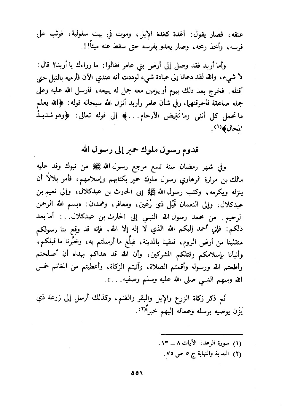 لا شيء، والله لقد دعانا إلى عبادة شيء لوددت أنه عندي الان فأرميه بالنبل حتى أقتله. فخرج بعد ذلك بيوم أو يومين معه جمل له يبيعه، فأرسل الله عليه وعلى جمله صاعقة فأحرقتهما، وفي شأن عامر وأربد أنزل الله سبحانه قوله: اللَّهُ يَعْلَمُ ما تَحْمِلُ كُلُّ أُنْثى وَما تَغِيضُ الْأَرْحامُ ... إلى قوله تعالى: وَهُوَ شَدِيدُ الْمِحالِ «1» .
