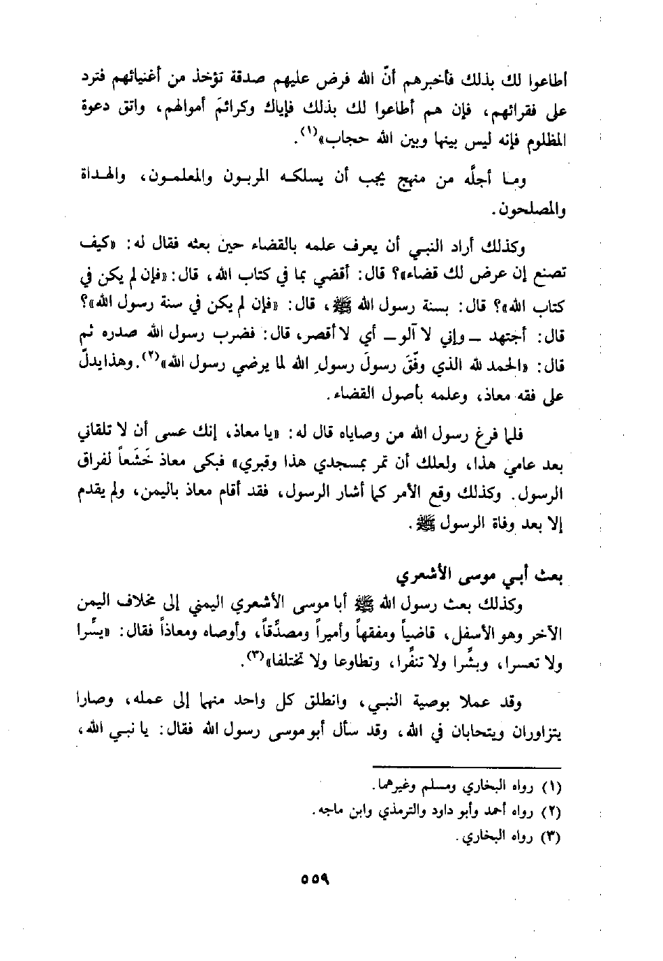 وكذلك أراد النبي أن يعرف علمه بالقضاء حين بعثه فقال له: «كيف تصنع إن عرض لك قضاء» ؟ قال: أقضي بما في كتاب الله، قال: «فإن لم يكن في كتاب الله» ؟ قال: بسنة رسول الله صلى الله عليه وسلم، قال: «فإن لم يكن في سنة رسول الله» ؟
