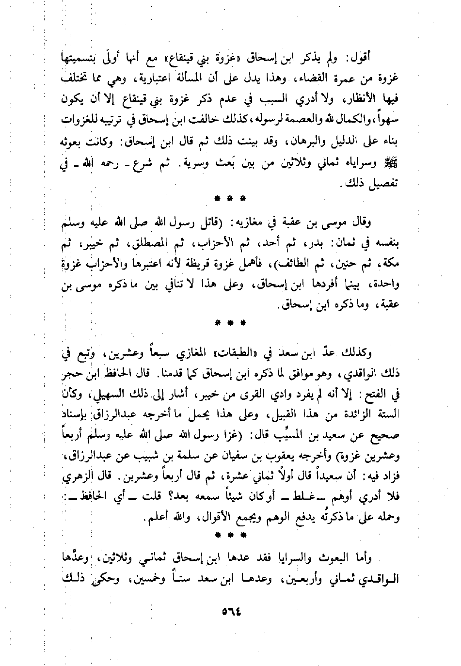 وكذلك عدّ ابن سعد في «الطبقات» المغازي سبعا وعشرين، وتبع في ذلك الواقدي، وهو موافق لما ذكره ابن إسحاق كما قدمنا. قال الحافظ ابن حجر في الفتح: إلا أنه لم يفرد وادي القرى من خيبر، أشار إلى ذلك السهيلي، وكأن الستة الزائدة من هذا القبيل، وعلى هذا يحمل ما أخرجه عبد الرزاق بإسناد صحيح عن سعيد بن المسيّب قال: (غزا رسول الله صلى الله عليه وسلم أربعا وعشرين غزوة) وأخرجه يعقوب بن سفيان عن سلمة بن شبيب عن عبد الرزاق، فزاد فيه: أن سعيدا قال أولا ثماني عشرة، ثم قال أربعا وعشرين. قال الزهري فلا أدري أوهم- غلط- أو كان شيئا سمعه بعد؟ قلت- أي الحافظ-: