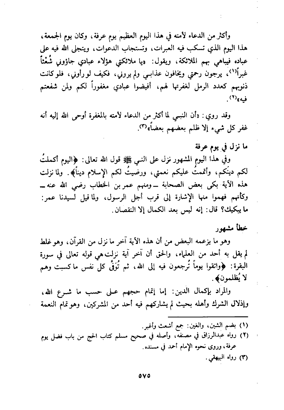 (2) رواه عبد الرزاق في مصنفه، وأصله في صحيح مسلم كتاب الحج من باب فضل يوم عرفة، وروى نحوه الإمام أحمد في مسنده.