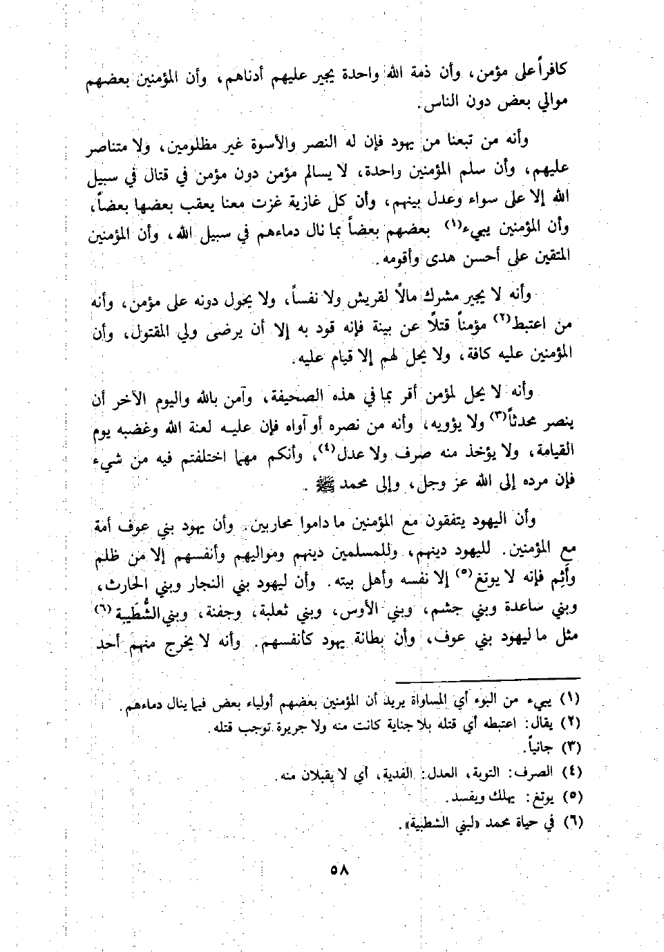 وأنه لا يحل لمؤمن أقر بما في هذه الصحيفة، وامن بالله واليوم الاخر أن ينصر محدثا «3» ولا يؤويه، وأنه من نصره أو اواه فإن عليه لعنة الله وغضبه يوم القيامة، ولا يؤخذ منه صرف ولا عدل «4» ، وأنكم مهما اختلفتم فيه من شيء فإن مرده إلى الله عز وجل، وإلى محمد صلى الله عليه وسلم.