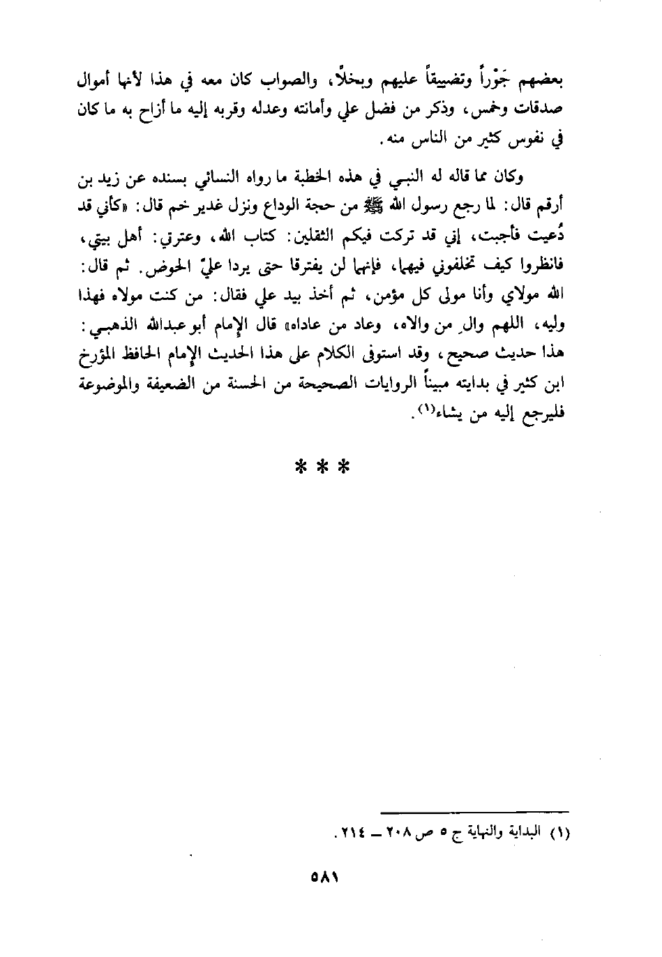 وكان مما قاله له النبي في هذه الخطبة ما رواه النسائي بسنده عن زيد بن أرقم قال: لما رجع رسول الله صلى الله عليه وسلم من حجة الوداع ونزل غدير خم قال: «كأني قد دعيت فأجبت، إني قد تركت فيكم الثقلين: كتاب الله، وعترتي: أهل بيتي، فانظروا كيف تخلفوني فيهما، فإنهما لن يفترقا حتى يردا عليّ الحوض. ثم قال: