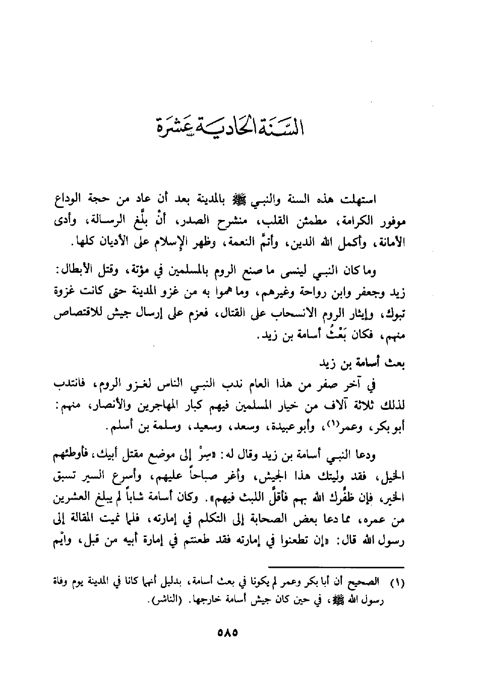 (1) الصحيح أن أبا بكر وعمر لم يكونا في بعث أسامة، بدليل أنهما كانا في المدينة يوم وفاة رسول الله صلى الله عليه وسلم، في حين كان جيش أسامة خارجها. (الناشر) .