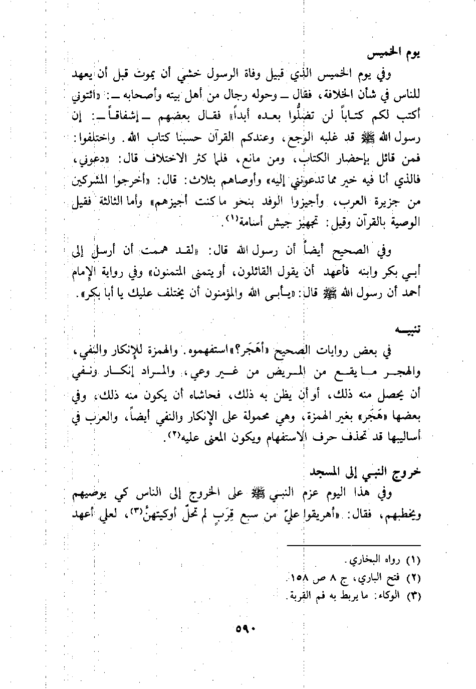 وفي يوم الخميس الذي قبيل وفاة الرسول خشي أن يموت قبل أن يعهد للناس في شأن الخلافة، فقال- وحوله رجال من أهل بيته وأصحابه-: «ائتوني أكتب لكم كتابا لن تضلّوا بعده أبدا» فقال بعضهم- إشفاقا-: إن رسول الله صلى الله عليه وسلم قد غلبه الوجع، وعندكم القران حسبنا كتاب الله. واختلفوا: