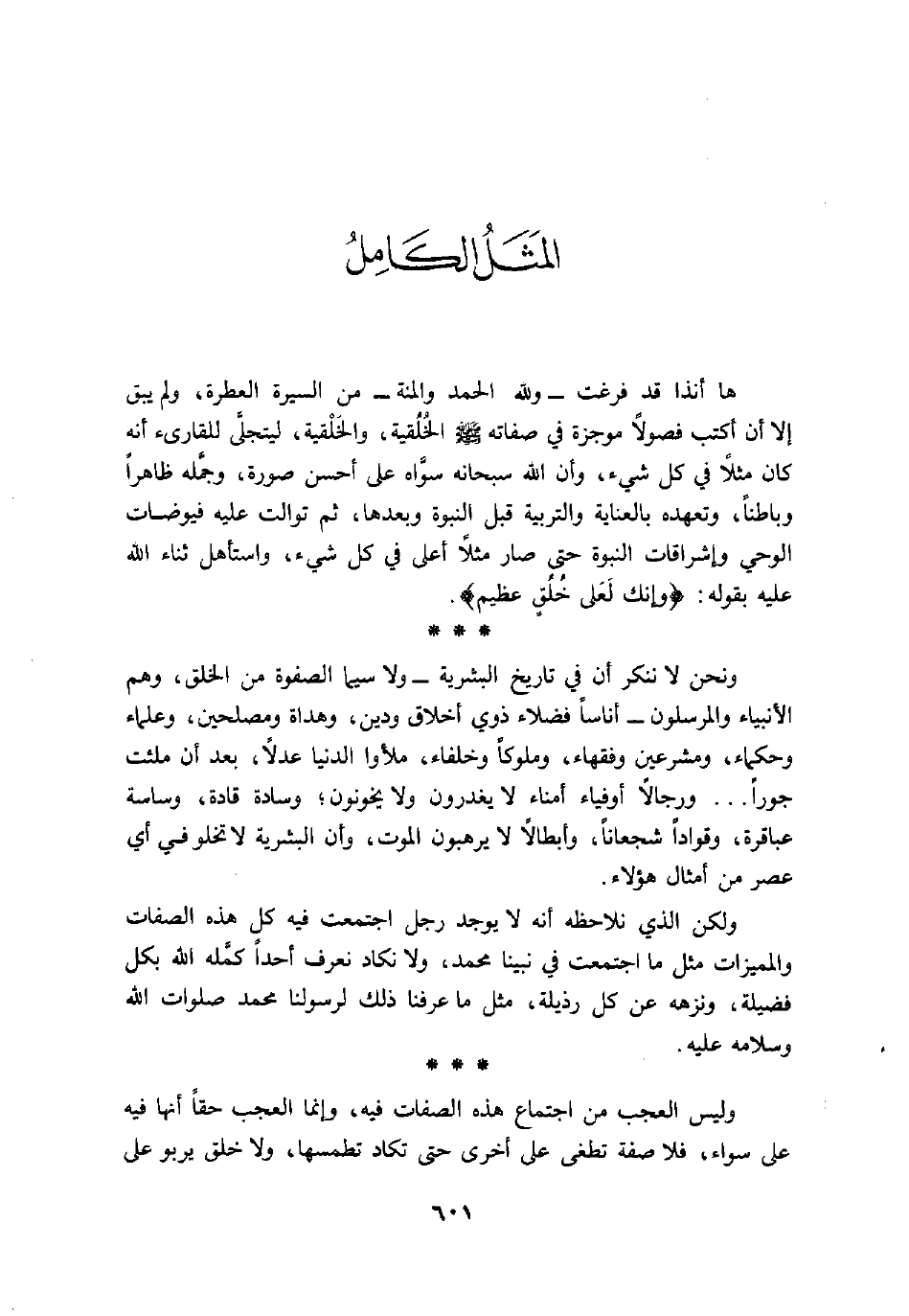 ها أنذا قد فرغت- ولله الحمد والمنة- من السيرة العطرة، ولم يبق إلا أن أكتب فصولا موجزة في صفاته صلى الله عليه وسلم الخلقية، والخلقية، ليتجلّى للقارىء أنه كان مثلا في كل شيء، وأن الله سبحانه سوّاه على أحسن صورة، وجمّله ظاهرا وباطنا، وتعهده بالعناية والتربية قبل النبوة وبعدها، ثم توالت عليه فيوضات الوحي وإشراقات النبوة حتى صار مثلا أعلى في كل شيء، واستأهل ثناء الله عليه بقوله: وَإِنَّكَ لَعَلى خُلُقٍ عَظِيمٍ.
