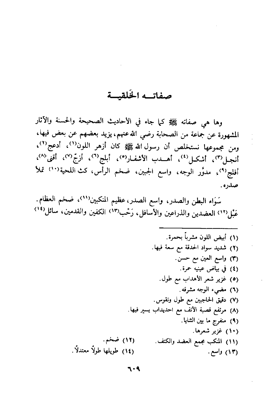 عبل «12» العضدين والذراعين والأسافل، رحب «13» الكفين والقدمين، سائل «14»