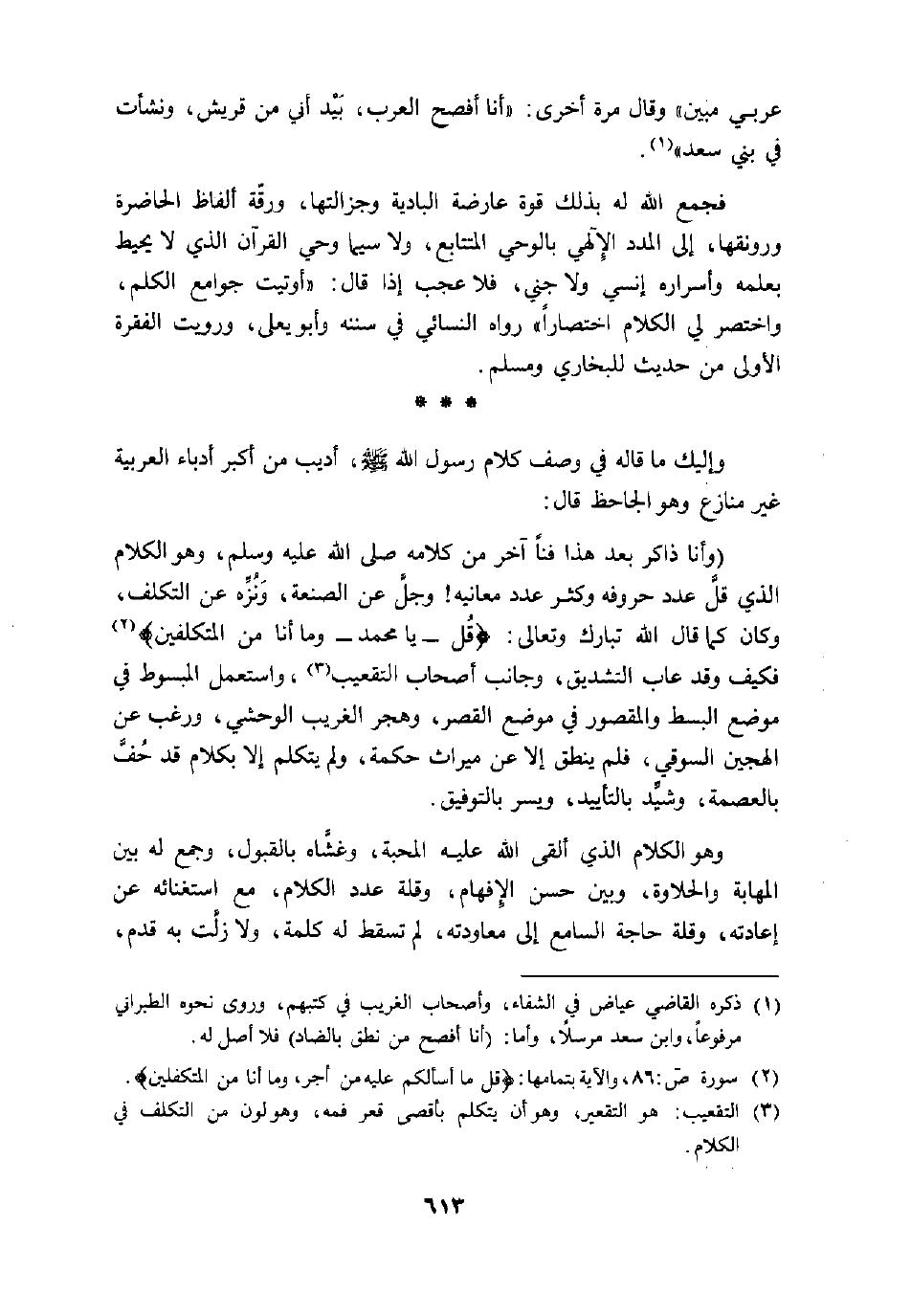 (وأنا ذاكر بعد هذا فنا اخر من كلامه صلى الله عليه وسلم، وهو الكلام الذي قلّ عدد حروفه وكثر عدد معانيه! وجلّ عن الصنعة، ونزّه عن التكلف، وكان كما قال الله تبارك وتعالى: قُلْ- يا محمد- وَما أَنَا مِنَ الْمُتَكَلِّفِينَ «2» فكيف وقد عاب التشديق، وجانب أصحاب التقعيب «3» ، واستعمل المبسوط في موضع البسط والمقصور في موضع القصر، وهجر الغريب الوحشي، ورغب عن الهجين السوقي، فلم ينطق إلا عن ميراث حكمة، ولم يتكلم إلا بكلام قد حفّ بالعصمة، وشيّد بالتأييد، ويسر بالتوفيق.