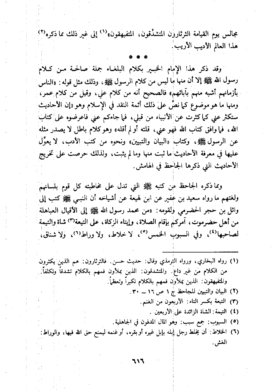 ومما ذكره الجاحظ من كتبه صلى الله عليه وسلم التي تدل على مخاطبته كل قوم بلسانهم ولغتهم ما رواه سعيد بن عفير عن ابن لهيعة عن أشياخه أن النبي صلى الله عليه وسلم كتب إلى وائل بن حجر الحضرمي ولقومه: «من محمد رسول الله صلى الله عليه وسلم إلى الأقيال العباهلة من أهل حضرموت، امركم بإقام الصلاة، وإيتاء الزكاة، على التيعة «3» شاة والتيمة لصاحبها «4» ، وفي السبوب الخمس «5» ، لا خلاط، ولا وراط «6» ، ولا شناق،