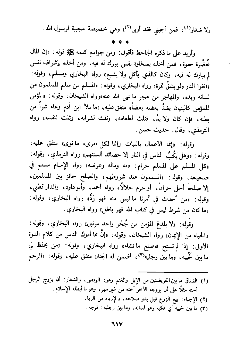 وقوله: «إنما الأعمال بالنيات وإنما لكل امرىء ما نوى» متفق عليه، وقوله: «وهل يكبّ الناس في النار إلا حصائد ألسنتهم» رواه الترمذي، وقوله: