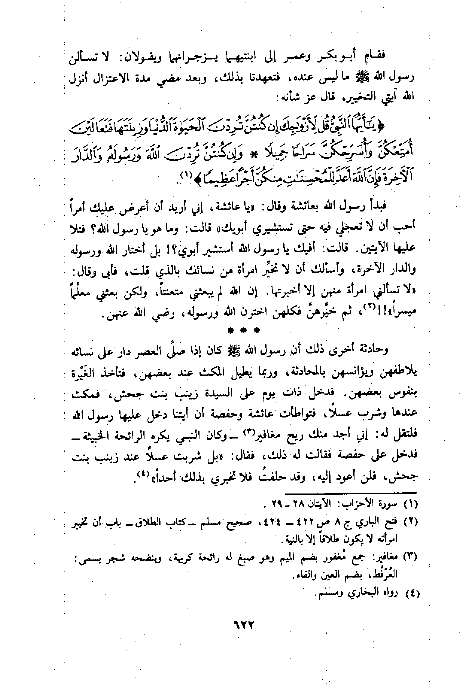 يا أَيُّهَا النَّبِيُّ قُلْ لِأَزْواجِكَ إِنْ كُنْتُنَّ تُرِدْنَ الْحَياةَ الدُّنْيا وَزِينَتَها فَتَعالَيْنَ أُمَتِّعْكُنَّ وَأُسَرِّحْكُنَّ سَراحاً جَمِيلًا. وَإِنْ كُنْتُنَّ تُرِدْنَ اللَّهَ وَرَسُولَهُ وَالدَّارَ الْآخِرَةَ فَإِنَّ اللَّهَ أَعَدَّ لِلْمُحْسِناتِ مِنْكُنَّ أَجْراً عَظِيماً «1» .