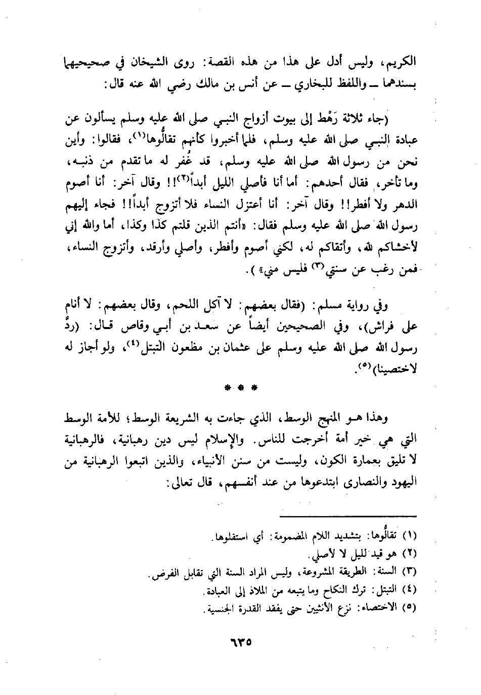 (جاء ثلاثة رهط إلى بيوت أزواج النبي صلى الله عليه وسلم يسألون عن عبادة النبي صلى الله عليه وسلم، فلما أخبروا كأنهم تقالّوها «1» ، فقالوا: وأين نحن من رسول الله صلى الله عليه وسلم، قد غفر له ما تقدم من ذنبه، وما تأخر، فقال أحدهم: أما أنا فأصلي الليل أبدا «2» !! وقال اخر: أنا أصوم الدهر ولا أفطر!! وقال اخر: أنا أعتزل النساء فلا أتزوج أبدا!! فجاء إليهم رسول الله صلى الله عليه وسلم فقال: «أنتم الذين قلتم كذا وكذا، أما والله إني لأخشاكم لله، وأتقاكم له، لكني أصوم وأفطر، وأصلي وأرقد، وأتزوج النساء، فمن رغب عن سنتي «3» فليس مني» ) .