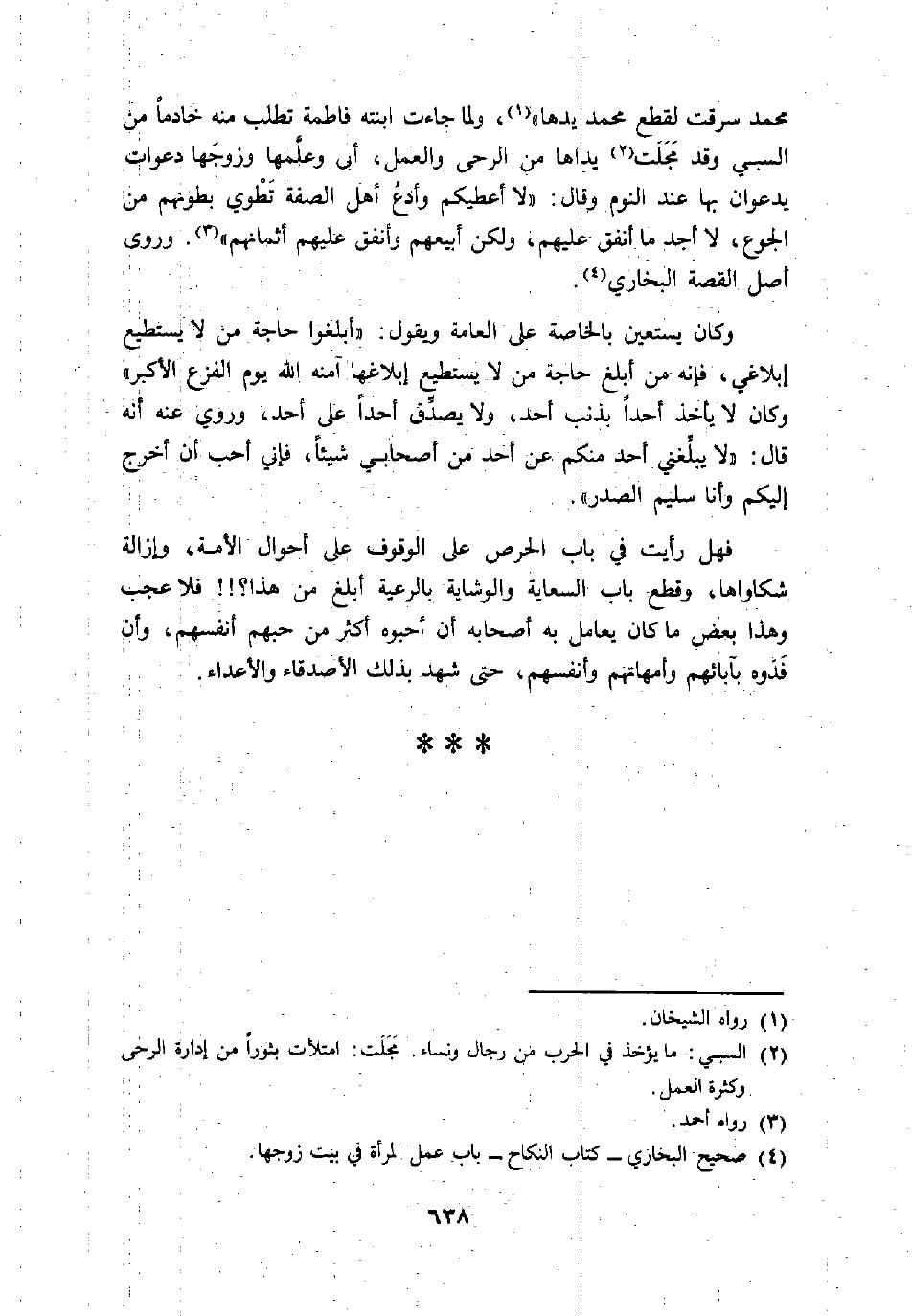 محمد سرقت لقطع محمد يدها» «1» ، ولما جاءت ابنته فاطمة تطلب منه خادما من السبي وقد مجلت «2» يداها من الرحى والعمل، أبى وعلّمها وزوجها دعوات يدعوان بها عند النوم وقال: «لا أعطيكم وأدع أهل الصفة تطوي بطونهم من الجوع، لا أجد ما أنفق عليهم، ولكن أبيعهم وأنفق عليهم أثمانهم» «3» . وروى أصل القصة البخاري «4» .