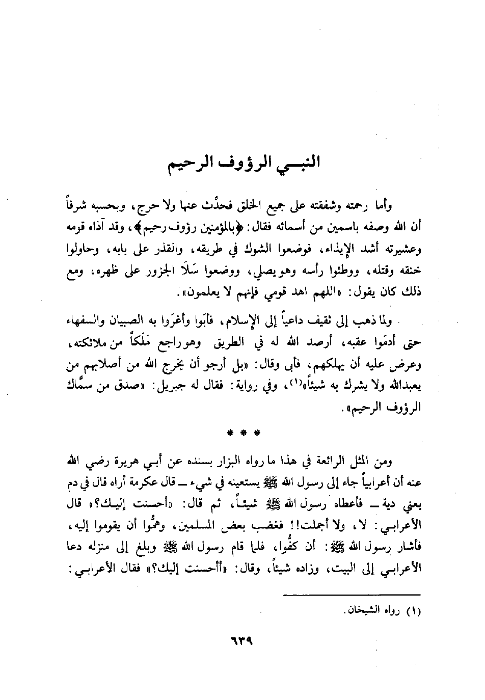 وأما رحمته وشفقته على جميع الخلق فحدّث عنها ولا حرج، وبحسبه شرفا أن الله وصفه باسمين من أسمائه فقال: بِالْمُؤْمِنِينَ رَؤُفٌ رَحِيمٌ، وقد اذاه قومه وعشيرته أشد الإيذاء، فوضعوا الشوك في طريقه، والقذر على بابه، وحاولوا خنقه وقتله، ووطئوا رأسه وهو يصلي، ووضعوا سلا الجزور على ظهره، ومع ذلك كان يقول: «اللهم اهد قومي فإنهم لا يعلمون» .