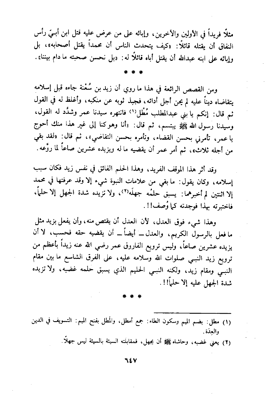 وهذا شيء فوق العدل، لأن العدل أن يقتص منه، وأن يفعل بزيد مثل ما فعل بالرسول الكريم، والعدل- أيضا- أن يقضيه حقه فحسب، لا أن يزيده عشرين صاعا، وليس ترويع الفاروق عمر رضي الله عنه زيدا بأعظم من ترويع زيد النبي صلوات الله وسلامه عليه، على الفرق الشاسع ما بين مقام النبي ومقام زيد، ولكنه النبي الحليم الذي يسبق حلمه غضبه، ولا تزيده شدة الجهل عليه إلا حلما!!.