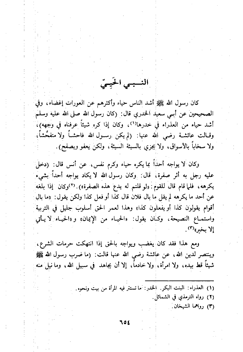 كان رسول الله صلى الله عليه وسلم أشد الناس حياء وأكثرهم عن العورات إغضاء، وفي الصحيحين عن أبي سعيد الخدري قال: (كان رسول الله صلى الله عليه وسلم أشد حياء من العذراء في خدرها «1» ، وكان إذا كره شيئا عرفناه في وجهه) ، وقالت عائشة رضي الله عنها: (لم يكن رسول الله فاحشا ولا متفحّشا، ولا سخابا بالأسواق، ولا يجزي بالسيئة السيئة، ولكن يعفو ويصفح) .