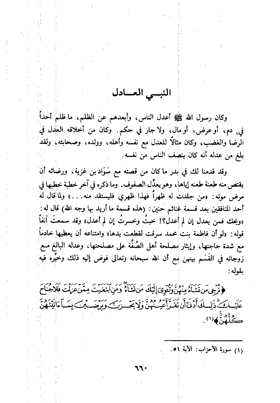 «ويحك فمن يعدل إن لم أعدل؟! خبت وخسرت إن لم أعدل» وقد سمعت انفا قوله: «لو أن فاطمة بنت محمد سرقت لقطعت يدها» وامتناعه أن يعطيها خادما مع شدة حاجتها، وإيثار مصلحة أهل الصفّة على مصلحتها، وعدله البالغ مع زوجاته في القسم بينهن مع أن الله سبحانه وتعالى فوض إليه ذلك وخيّره فيه بقوله: