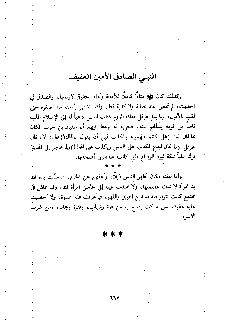 وكذلك كان صلى الله عليه وسلم مثالا كاملا للأمانة وأداء الحقوق لأربابها، والصدق في الحديث، لم تحص عنه خيانة ولا كذبة قط، ولقد اشتهر بأمانته منذ صغره حتى لقب بالأمين، ولما بلغ هرقل ملك الروم كتاب النبي داعيا له إلى الإسلام طلب ناسا من قومه يسألهم عنه، فجيء له برهط فيهم أبو سفيان بن حرب فكان مما قال له: (هل كنتم تتهمونه بالكذب قبل أن يقول ما قال؟) قال: لا، قال هرقل: (ما كان ليدع الكذب على الناس ويكذب على الله!!) ولما هاجر إلى المدينة ترك عليا بمكة ليرد الودائع التي كانت عنده إلى أصحابها.