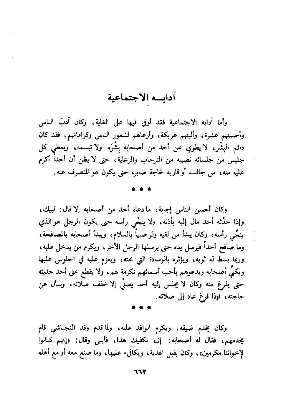 وأما ادابه الاجتماعية فقد أوفى فيها على الغاية، وكان ادب الناس وأحسنهم عشرة، وألينهم عريكة، وأرعاهم لشعور الناس وكراماتهم، فقد كان دائم البشر، لا يطوي عن أحد من أصحابه بشره، ولا تبسمه، ويعطي كل جليس من جلسائه نصيبه من الترحاب والرعاية، حتى لا يظن أن أحدا أكرم عليه منه، من جالسه أو قاربه لحاجة صابره حتى يكون هو المنصرف عنه.