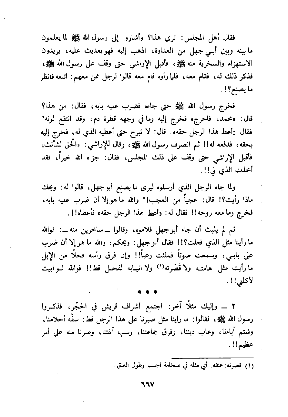قال: «محمد، فاخرج» فخرج إليه وما في وجهه قطرة دم، وقد انتقع لونه! فقال: «أعط هذا الرجل حقه» . قال: لا تبرح حتى أعطيه الذي له، فخرج إليه بحقه، فدفعه له!! ثم انصرف رسول الله صلى الله عليه وسلم، وقال للإراشي: «الحق لشأنك» فأقبل الإراشي حتى وقف على ذلك المجلس، فقال: جزاه الله خيرا، فقد أخذت الذي لي!!.